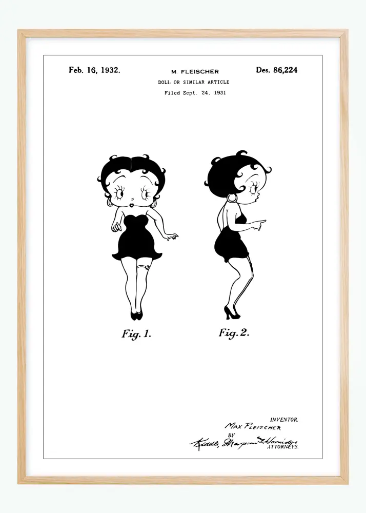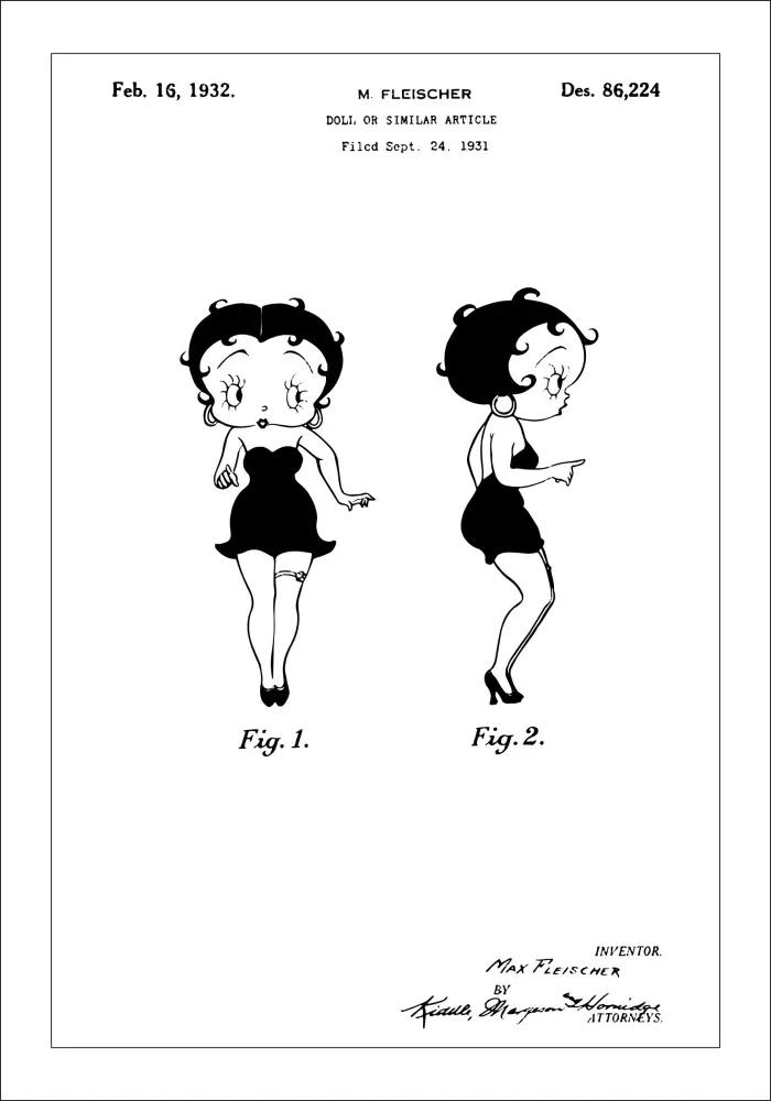 Tämä leikkisä ja nostalginen Betty Boopin patenttijuliste, jonka on suunnitellut M. Fleischer, kuten käy ilmi Yhdysvaltain patenttivirastosta 16. helmikuuta 1932 numerolla Des. 86,224. Hakupäivämääränä 24. syyskuuta 1931, tämä kuva heijastaa rakastettua lelukuvien aikakautta. Juliste, joka esittää nukkea kahdessa eri asennossa, on vastustamaton koriste-esine keräilijöille tai viehättävä lisä lapsen huoneeseen.