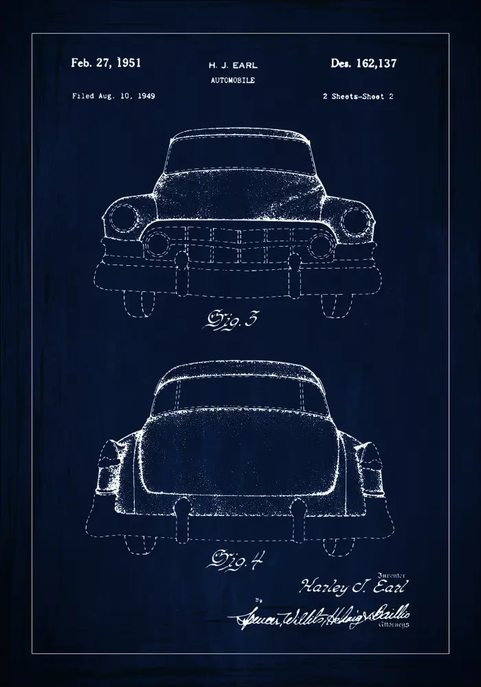 Tämä patenttijuliste kuvaa klassista Cladillac-autoa, joka on 1900-luvun puolivälin muotoilun ja innovaation symboli. H.J. Earl patentoi sen 27. helmikuuta 1951 patenttinumerolla Des. 162,137, ja se esittää auton muodon sekä etu- että takapuolelta. Tämä oli autoalan vaikuttava ajanjakso, ja tämä automalli heijastaa estetiikkaa ja muotoilua, joka on vaikuttanut pysyvästi myöhempiin autojen sukupolviin.