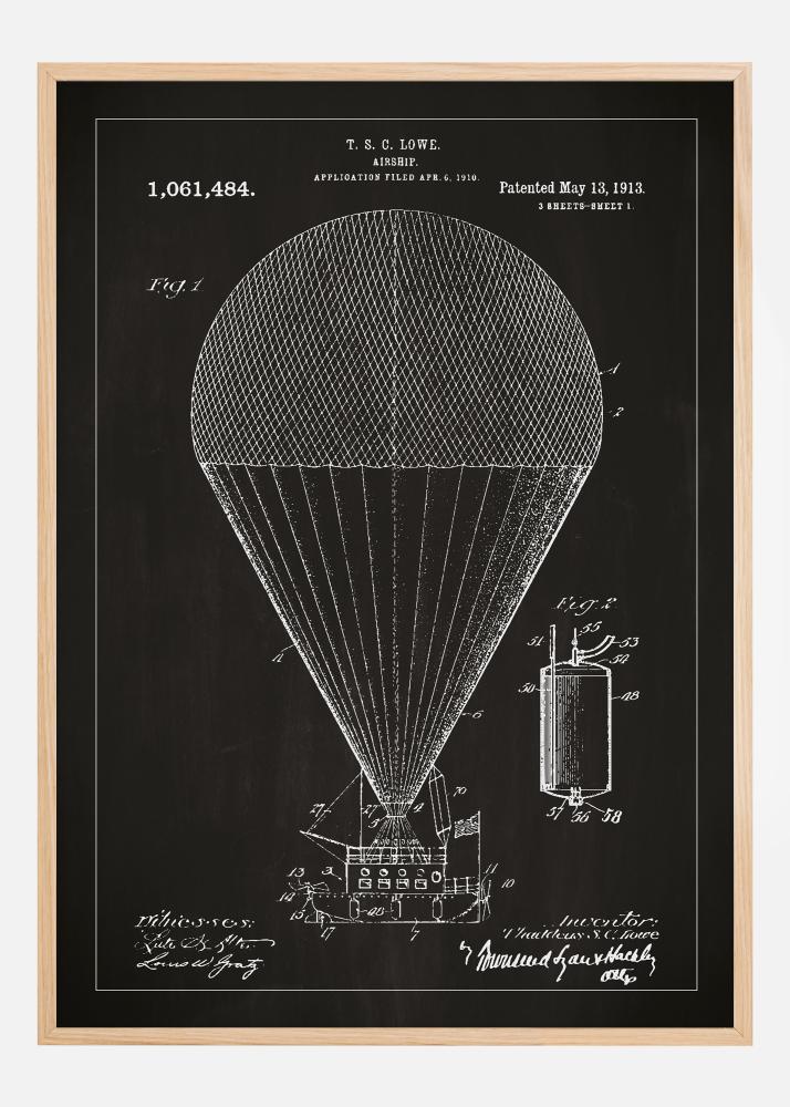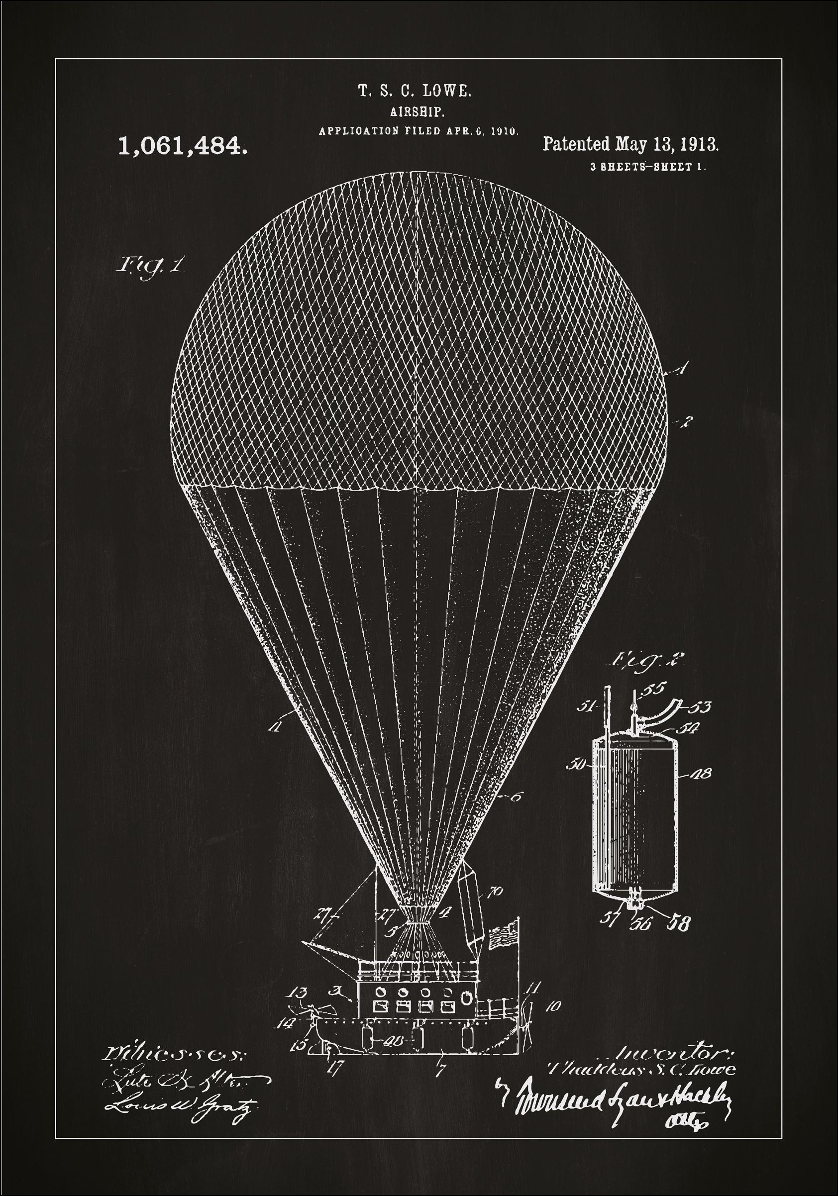 Tämä patenttijuliste vie meidät takaisin lentämisen taian ja seikkailun varhaisiin päiviin. Patentti, joka on päivätty 13. toukokuuta 1913 numerolla 1,061,484, kuvaa tämä huolellinen T. S. Lowen ilmalaivasuunnittelun jäljennös merkittävää teknologista virstanpylvästä inhimillisessä innovaatiossa. Se on erinomainen taiteellinen kuvastus varhaisista yrityksistä valloittaa taivaat.