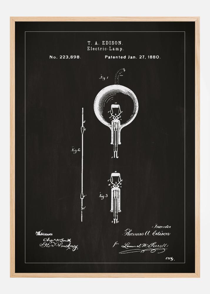 Tämä erottuva patenttijuliste korostaa Thomas A. Edisonin uraauurtavaa sähköisen lampun suunnittelua, joka on ikoninen läpimurto teknologian historiassa. Patenttinumero 223,898, myönnetty 27. tammikuuta 1880, tämä patenttipiirros edustaa mullistavaa keksintöä, joka muutti ihmiskunnan tapaa kokea valo. Kuvitus itsessään on taideteos, joka esittää Edisonin alkuperäisen rakenteen sekä eleganssilla että yksityiskohtaisuudella, tehden siitä ihanteellisen sisustuselementin jokaiseen tilaan ja erityisesti niille, jotka arvostavat tieteellistä innovaatiota ja muotoilua.