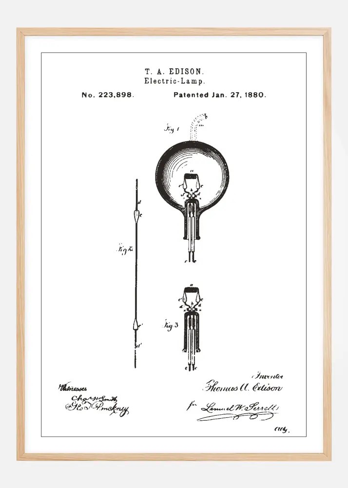 Tämä ajaton patenttijuliste esittää Thomas A. Edisonin mullistavan sähköisen lampun, joka on valaissut elämäämme siitä lähtien, kun se sai patenttinumeron 223,898, 27. tammikuuta 1880. Tämä tyylikäs ja opettavainen juliste on kunnianosoitus yhdelle kaikkien aikojen suurimmalle keksinnölle ja tarjoaa ainutlaatuisen näkymän teknologiseen innovointiin. Piirustuksen yksityiskohdat paljastavat hehkulampun keksimisen huolellisen prosessin, tuotteen, joka on keskeinen osa päivittäistä elämäämme. Tämä juliste on upea keskustelunavaaja ja inspiraation lähde, täydellinen jokaiselle, joka arvostaa historiallista teknologiaa ja designia.
