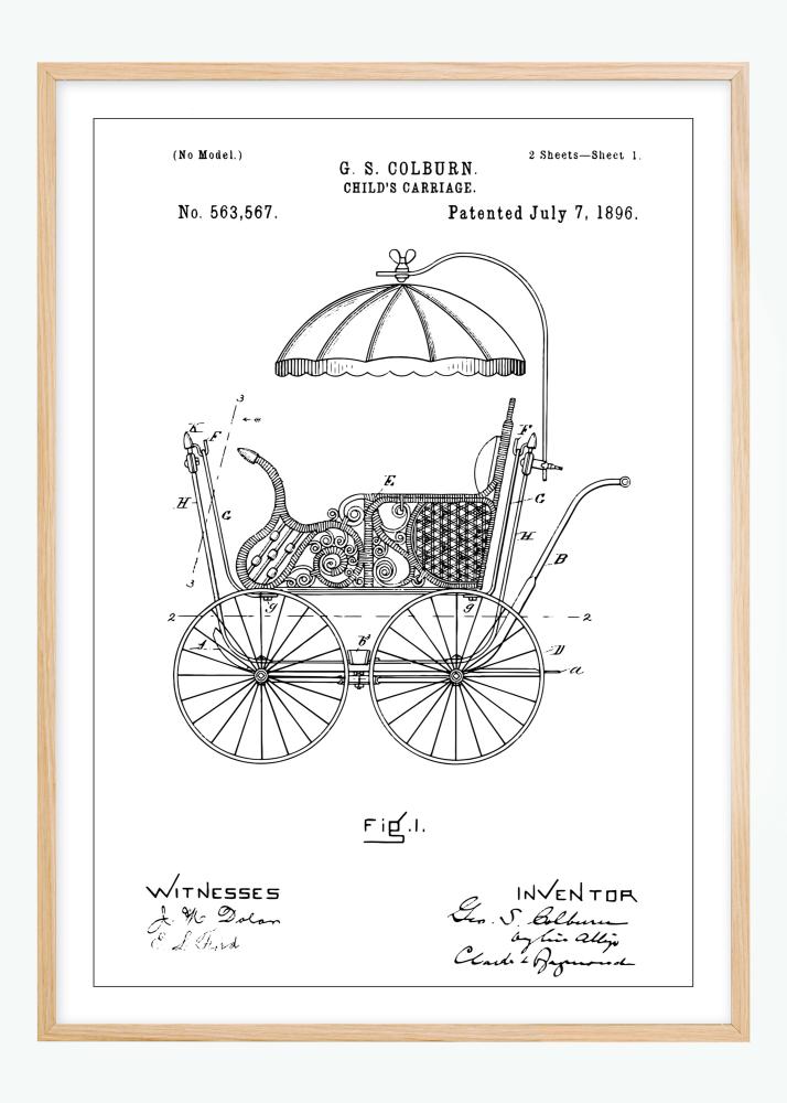 Korista kotiasi erikoisella julisteella, joka esittää ihastuttavien 1800-luvun lastenrattaiden patenttipiirustusta! Aikoinaan erittäin moderneina pidetyissä lastenvaunuissa oli koristeellisia yksityiskohtia ja lisävarusteena käytännöllinen aurinkovarjo. Muotoilija George S. Colburn halusi keksinnöllään ehkäistä lasten loukkaantumisia suunnittelemalla lastenvaunut, jotka pysyivät pystyasennossa kaikissa tilanteissa ja joissa oli lisäksi paremmat jarrut. Piirroksessa näkyy paljon tarkoin mietittyjä yksityiskohtia, ja juliste tekee seinästä kuin seinästä takuulla mielenkiintoisemman. Ylälaidasta käy ilmi mm. patentin myöntämispäivä 7. heinäkuuta 1896 sekä patentin numero. Alalaitaa koristavat keksijän ja todistajien nimikirjoitukset. Koska julistetta on saatavilla useita eri kokoja, löydät varmasti juuri sinun tarpeisiisi sopivan julisteen. Kattavasta valikoimastamme löydät helposti myös sisustustyyliisi sopivan kehyksen julisteellesi!Patenttipiirustus - Lastenrattaat I - Juliste painetaan meidän omassa painostudiossamme 230 gramman premium-luokan ja vanhentumattomalle paperille. Painamme julisteemme paksulle paperille mattapintaisina, jolloin lopputuloksena on kaunis, tasokas ja heijastamaton painotuote. Painamalla tuotteet itse, kestävästä metsätaloudesta peräisin olevalle paperille, vähennämme osaltamme ympäristökuormitusta.Kehys ei sisälly hintaan, mutta voidaan tilata erikseen.