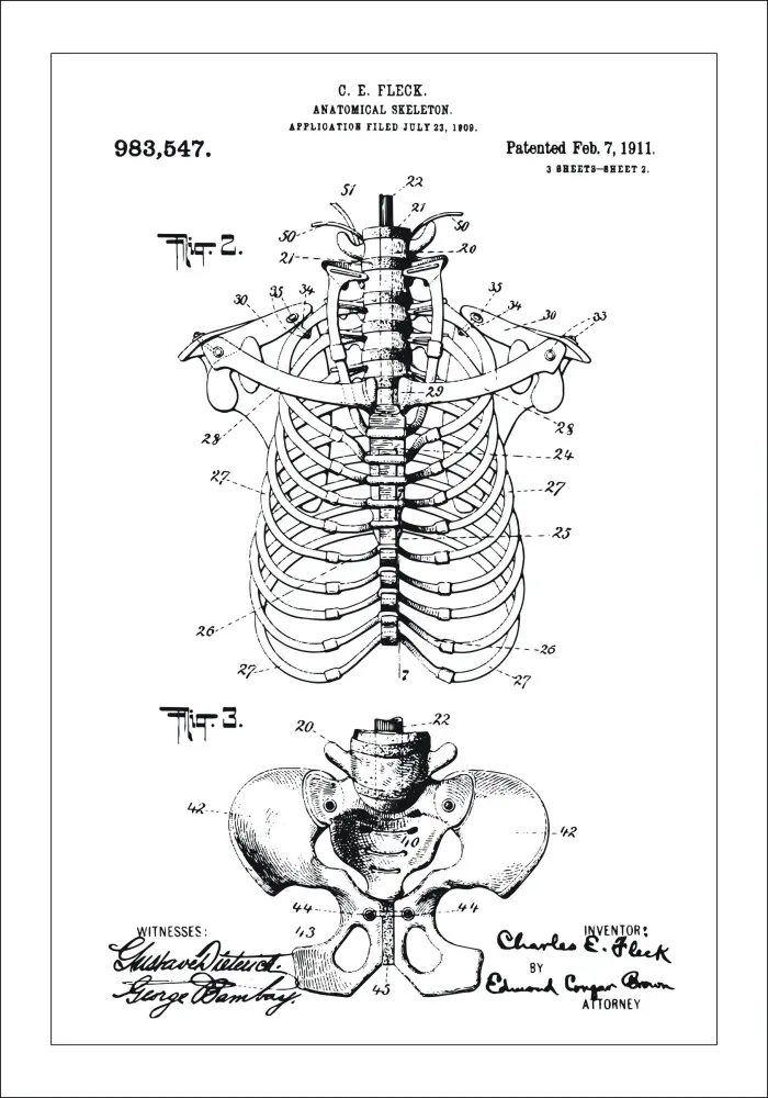 Tämä patenttijuliste esittää yksityiskohtaisen kuvituksen anatomisesta luurankorakenteesta, jonka patentoi C.E. Fleck 7. helmikuuta 1911 patenttinumerolla 983,547. Piirustus, joka jätettiin 23. heinäkuuta 1909, korostaa luurangon rakennetta ja mekaanisia liitäntöjä, erityisesti kuinka kylkiluut ja selkäranka on rakennettu esittämään ihmisen anatomiaa tarkasti ja pedagogisesti.
