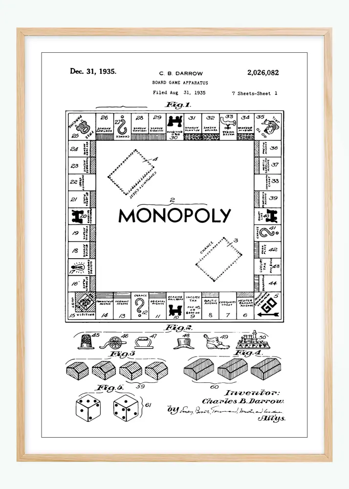 Tämä patenttijuliste kuvaa rakastetun lautapelin Monopoly klassisen muotoilun, joka on kulttuuri-ikoni perheviihteen ja pelien saralla. Päivämäärät osoittavat, että keksijä Charles B. Darrow haki patenttia 31. elokuuta 1935, ja se myönnettiin saman vuoden 31. joulukuuta numerolla 2,026,082. Yksityiskohtainen piirros esittää pelilaudan yleiskuvan, sisältäen tunnetut "lähtö", "mahdollisuus" ja kiinteistöt-ruudut sekä ikoniset pelinappulat ja nopat, luoden nostalgisen tunteen ja arvostuksen tätä ajaton peliä kohtaan.