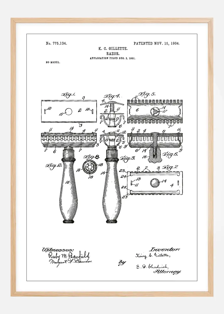 Ikonisen ja tyylikkään muotoilun kautta tämä patenttijuliste esittelee K.G. Gilletten mullistavan luomuksen: partahöylän, joka patentointiin 15. marraskuuta 1904, patenttinumerolla 775,134. Tämän patenttipiirustuksen yksityiskohdat korostavat mekaanisia puolia ja uudistavaa rakennetta, joka muutti henkilökohtaisen hygienian ikuisiksi ajoiksi, ja tämä dokumentoitiin ensimmäisen kerran joulukuussa 1901.