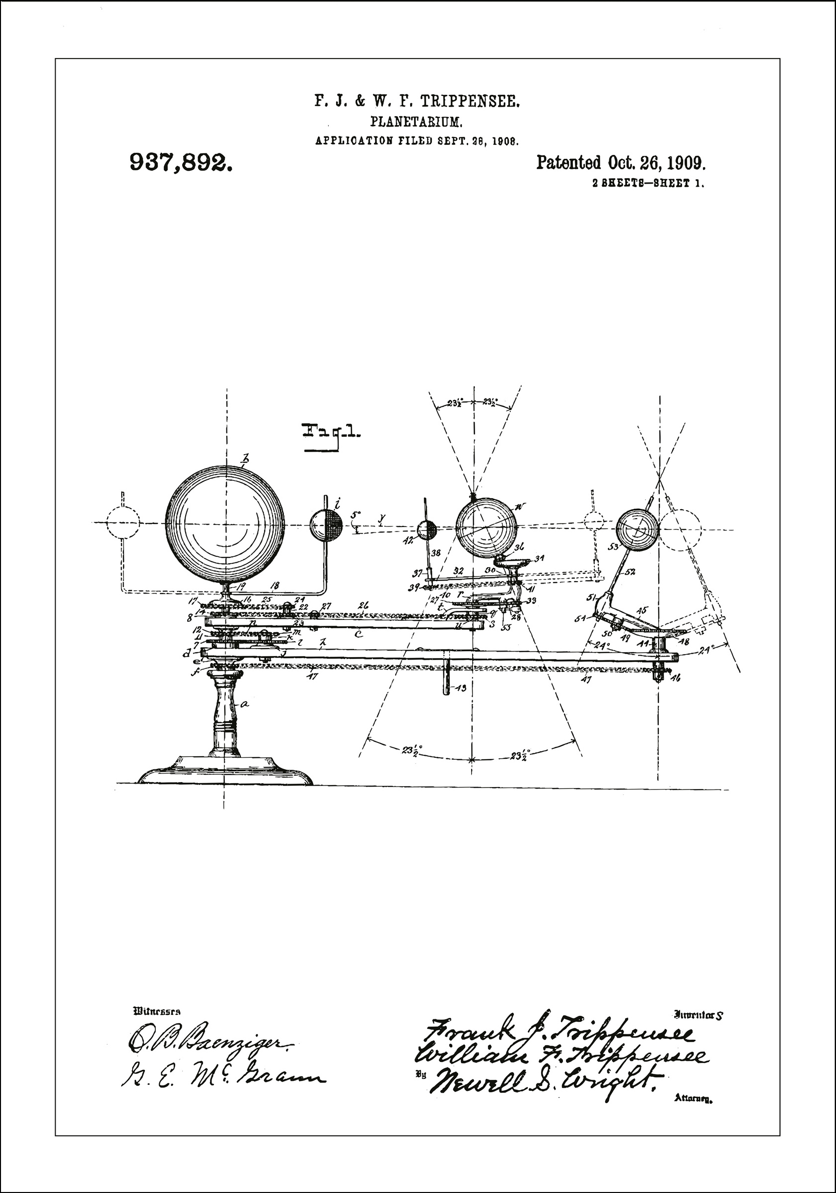Tämä tyylikäs patenttijuliste on kunnianosoitus insinööritaidolle ja taivaankappaleiden tutkimukselle, sisältäen yksityiskohtaisen esityksen F. J. & W. F. Trippenseesin planetaarioista, joka on klassinen keksintö 1900-luvun alusta. Patentti, numero 937,892, rekisteröitiin 26. lokakuuta 1909, ja hakemus tehtiin 28. syyskuuta 1908. Tämä taiteellisesti esitetty patenttidokumentti on ainutlaatuinen sisustuselementti, joka tarjoaa sekä historiantunnin että keskustelunavaajan. Se on ihanteellinen tiedehenkiselle tai tuomaan akateemista tunnelmaa kotiin, toimistoon tai luokkahuoneeseen.