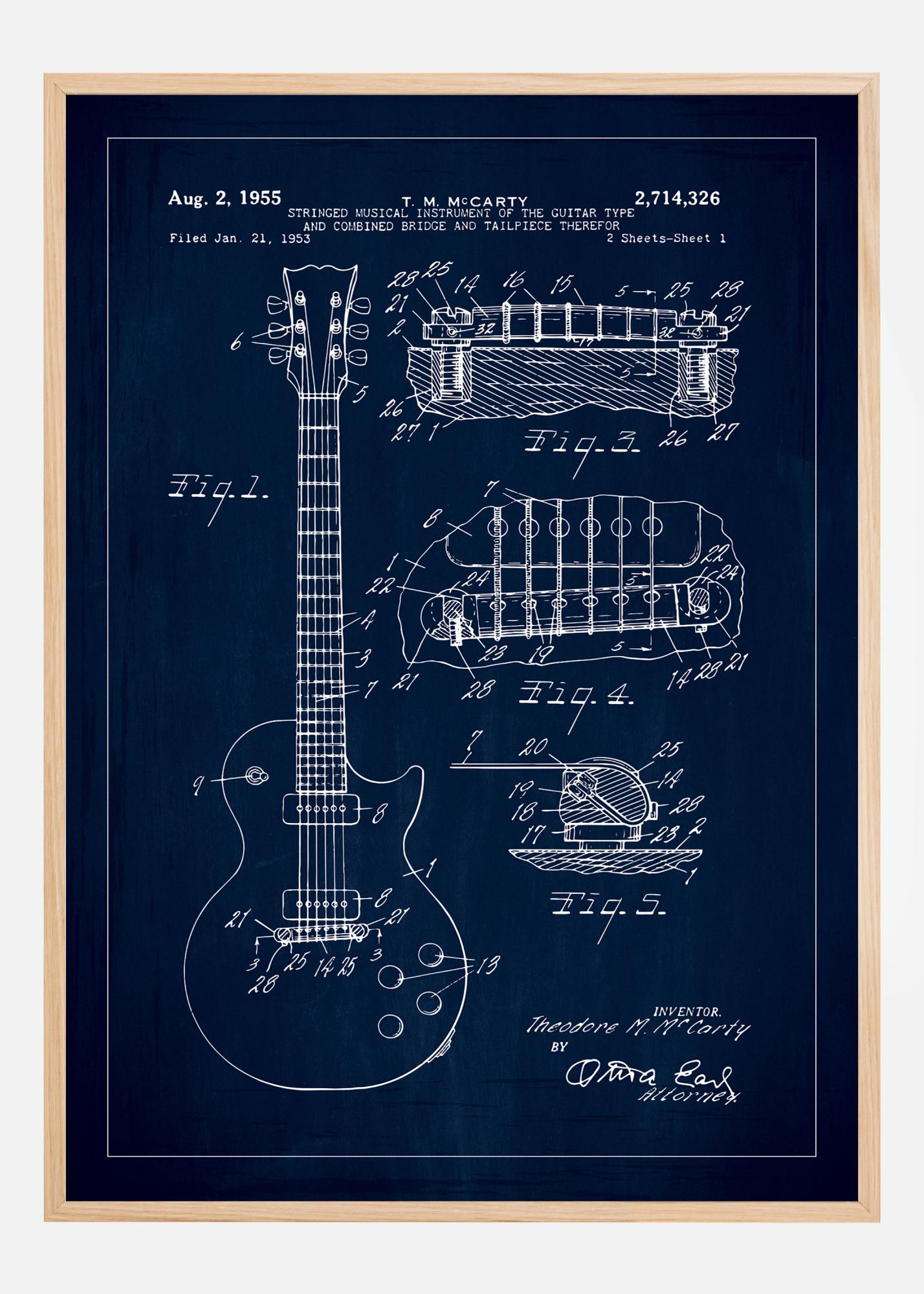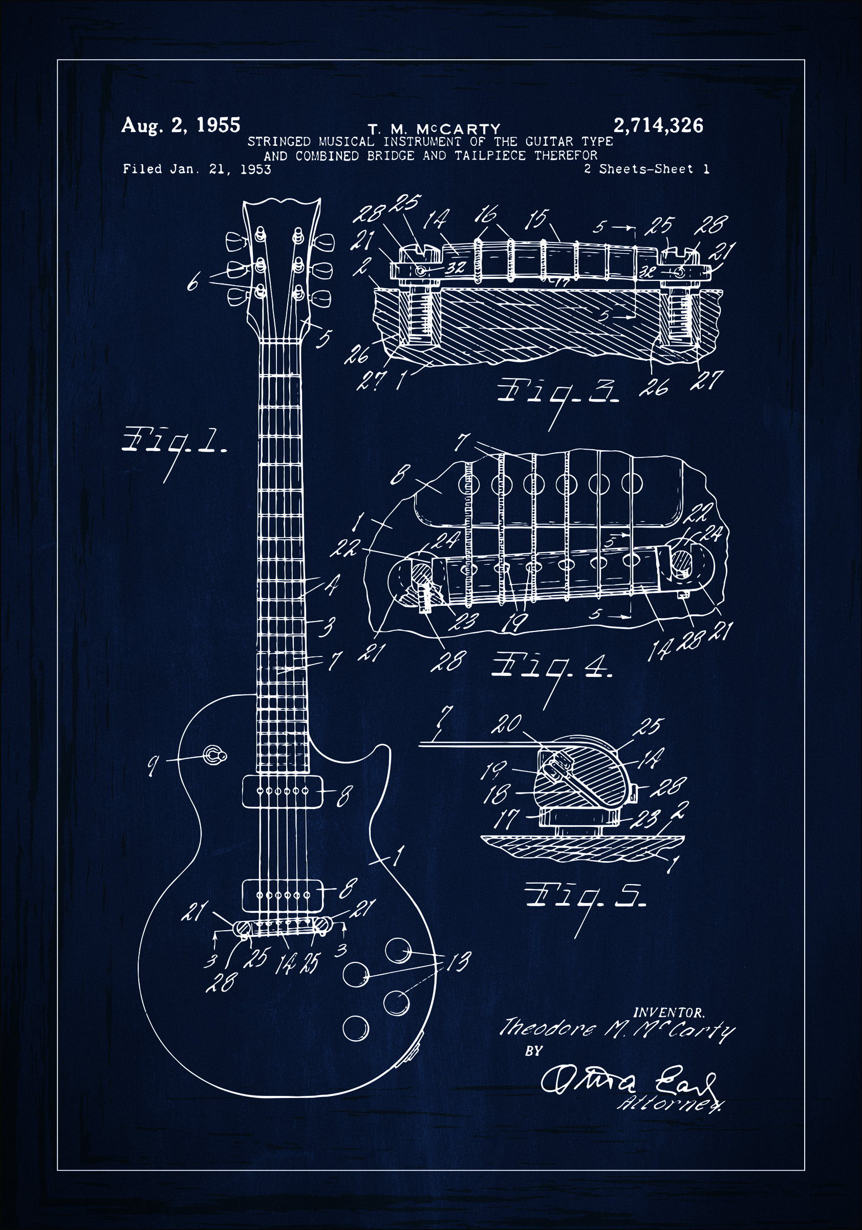 Tämä patenttijuliste esittelee yksityiskohtaisen ja tarkan piirustuksen jousisoittimesta 2. elokuuta 1955, patenttinumerolla 2,714,326. Tämän soittimen, jonka monet tunnistaisivat sähkökitaraksi, patentin rekisteröi Theodore M. McCarty 21. tammikuuta 1953. Juliste kuvaa soitinta tyylikkäässä kokonaiskuvassa sekä teknisesti edistyneissä yksityiskohtaisissa näkymissä, korostaen sen innovatiivista suunnittelua ja yhdistettyä siltaa ja tallaa osana sen ainutlaatuisia ominaisuuksia.