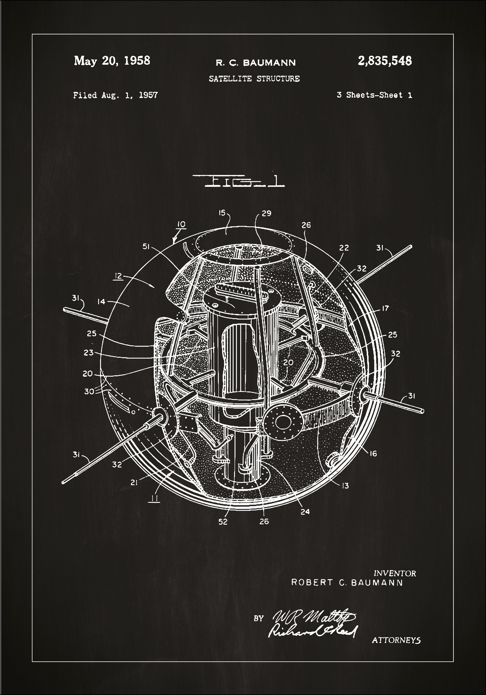 Tämä vaikuttava patenttijuliste kuvaa uraauurtavaa rakennetta avaruustekniikan aamunkoitteessa: R.C. Baumannin "Satellite Structure", patentoitu 20. toukokuuta 1958, patenttinumerolla 2,835,548. Jätetty 1. elokuuta 1957, tämä yksityiskohtainen patenttikuva esittää varhaista mallia keinotekoisesta satelliitista, joka on varustettu sen komponenteilla ja ainutlaatuisilla geometrisilla konfiguraatioilla, paljastaen innovaation hengen avaruuskilpailun aikakaudella.