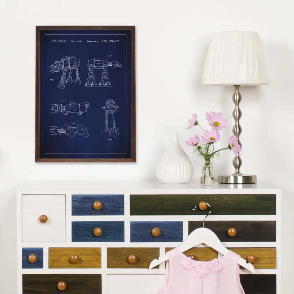 Tämä taidokas patenttijuliste kuvaa kuuluisan mallisuojan Des. 266,777 omaleimaisia rakennuspiirustuksia, joka rekisteröitiin 2. marraskuuta 1982. Kuvassa on teknisiä piirustuksia Star Wars -elokuvasta tutusta AT-AT:sta eri näkökulmista, ja jokainen esittelee laitteen ainutlaatuista rakennetta ja ominaisuuksia. Se esitetään syvänsinisellä taustalla, mikä antaa valkoisille viivapiirroksille elegantin ja modernin ilmeen.
