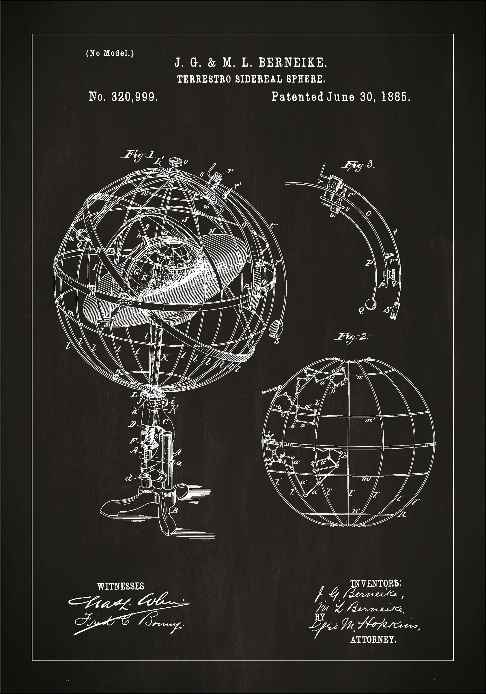 Tämä ainutlaatuinen patenttijuliste esittää kekseliään ja yksityiskohtaisen patenttipiirroksen Terrestro Sidereal Sphere -laitteesta, jonka patentoi 30. kesäkuuta 1885 J.G. & M.L. Berenike. Tämä monimutkainen muotoilu korostaa 1800-luvun innovaatioiden teknistä taituruutta ja luo tunteen historian siipien havinasta. Kuvitus koostuu monimutkaisista geometrisista muodoista, jotka yhdessä luovat mallin taivaankappaleiden liikkeistä suhteessa maahan, ja heijastavat aikakauden kiehtovia tähtitieteellisiä tietoja.