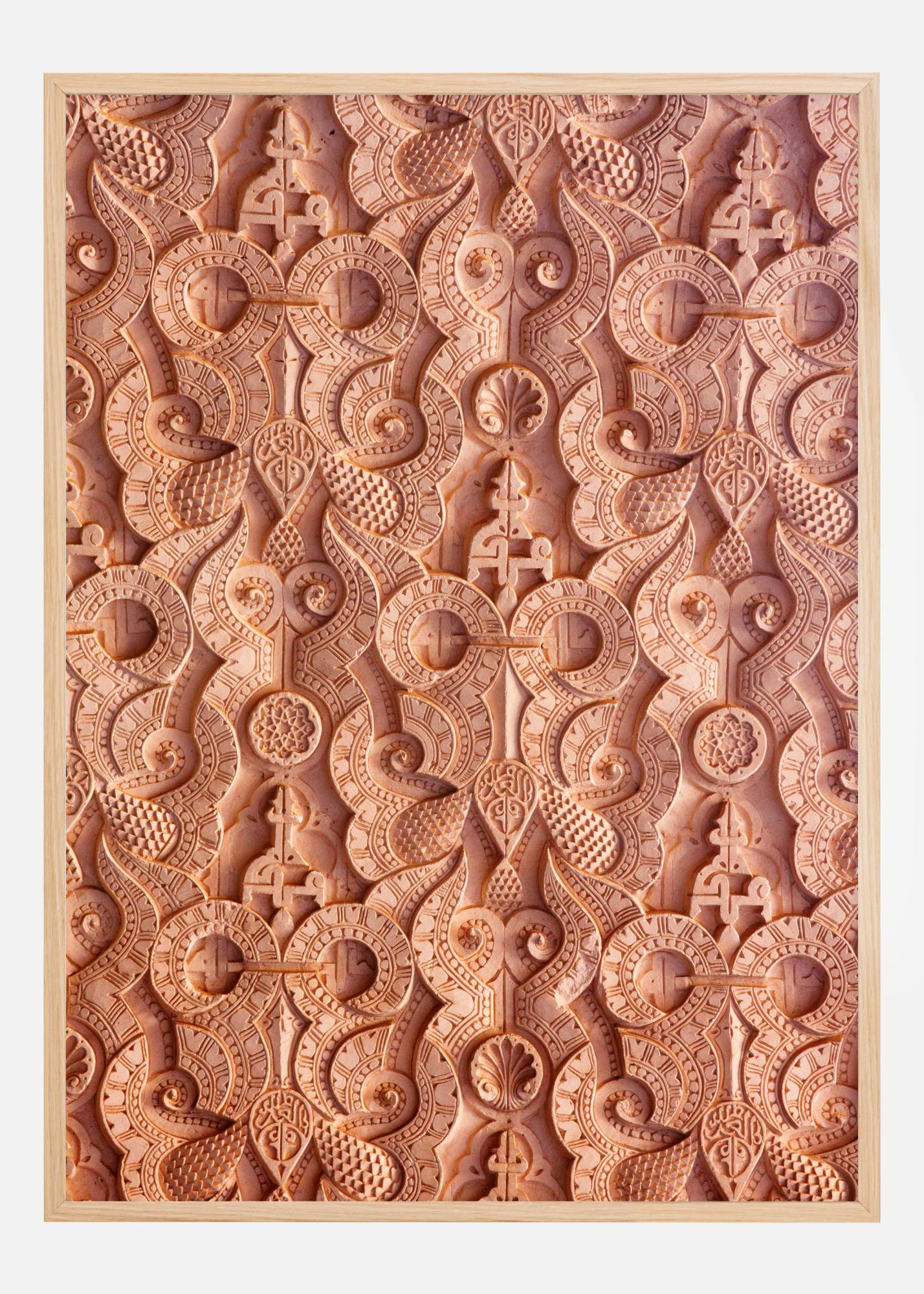 Teeman värit pysyvät lämpimän terrakotan ja saven paletissa, mikä antaa kuvalle luonnollisen ja rustiikkisen tunteen. Yksityiskohtainen kuvio erottuu hyvin yhtenäistä taustaa vasten ja luo kolmiulotteisen illuusion, joka on sekä houkutteleva että syvä. Tämä juliste on täydellinen henkilölle, joka arvostaa taidetta, joka kiinnittää katseen ja kutsuu lähempään tarkasteluun, ja joka arvostaa käsityötä ja perinteitä sisustustyylissään.