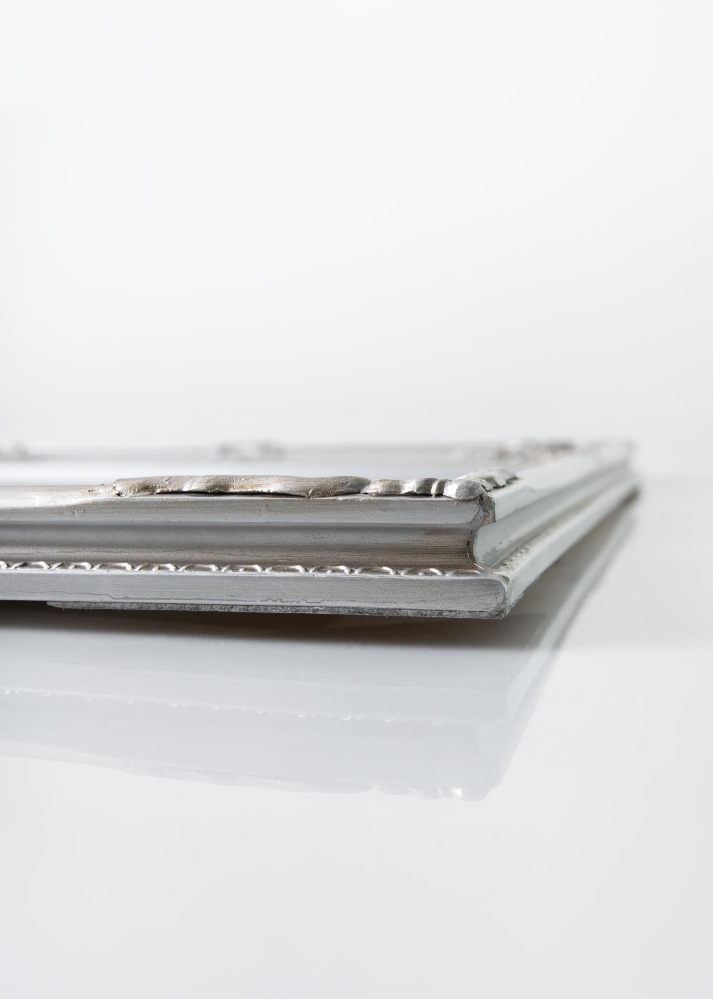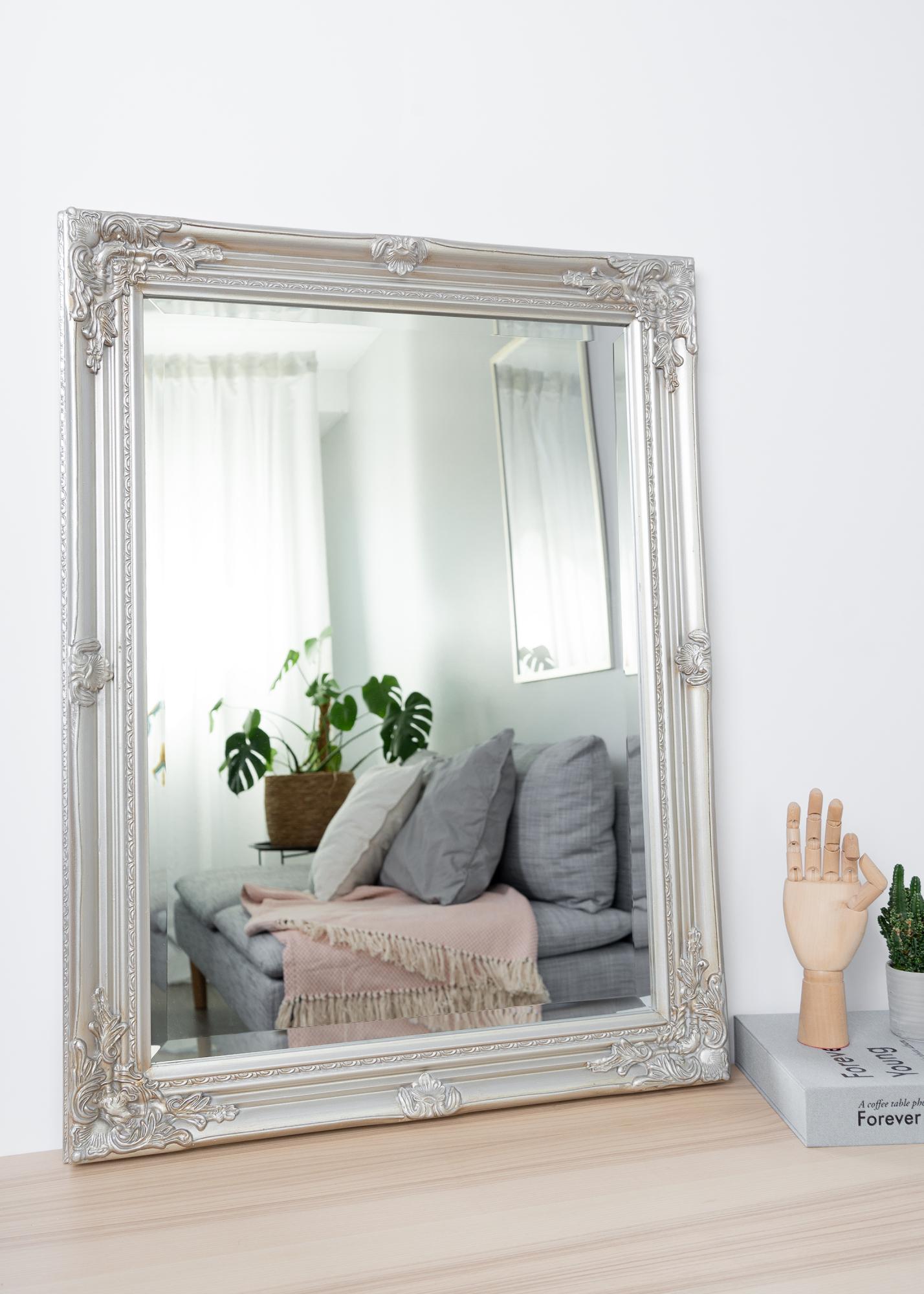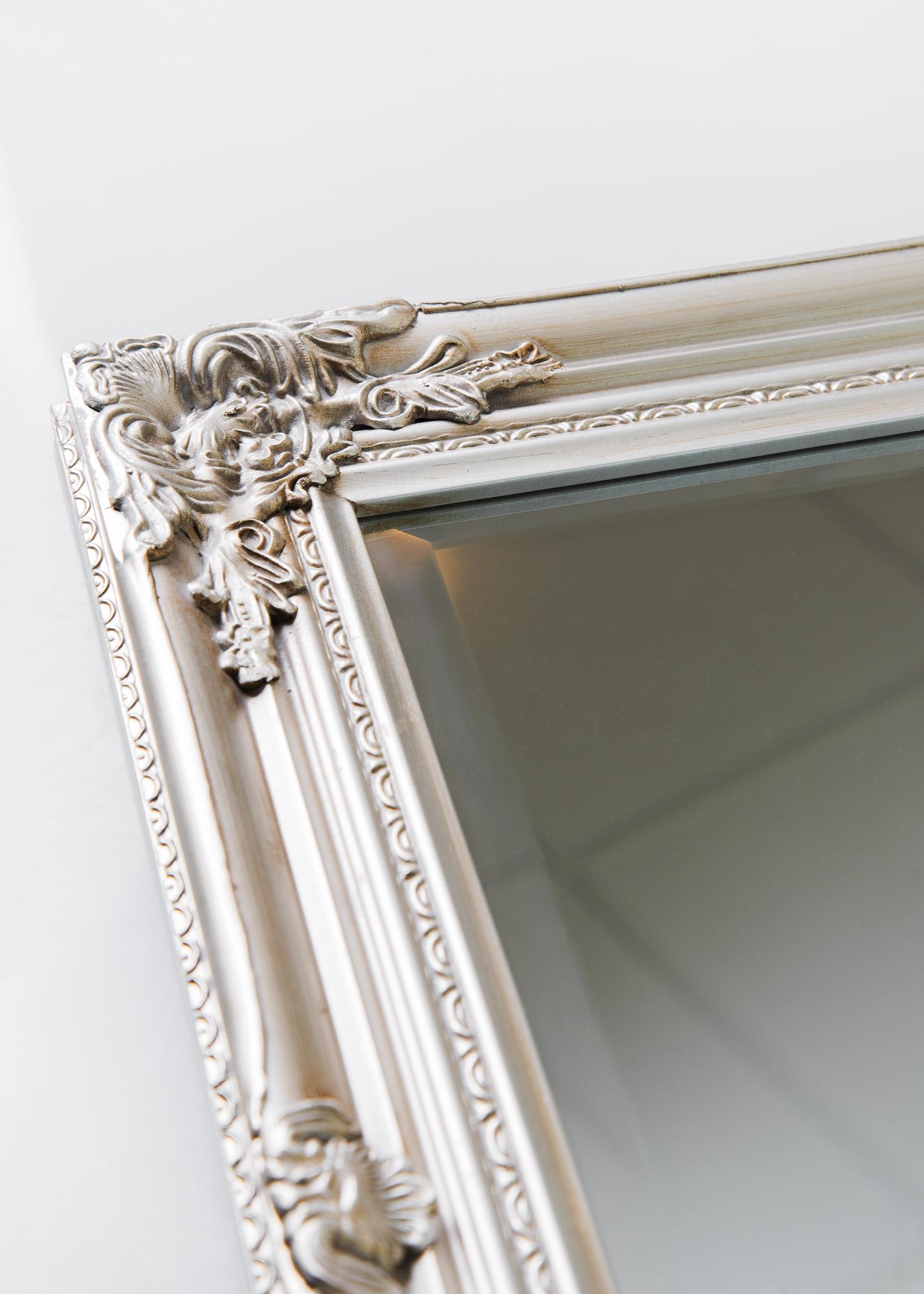 Peili Antique Hopeanvärinen on perinteisten muotojen mukaisesti tehty seinäpeili. Siinä on kaunis klassinen puinen kehys, jonka viimeistelee kaunis klassinen kipsistä valettu koriste. Kehyksen kaunis yksityiskohta kiinnittää huomion.