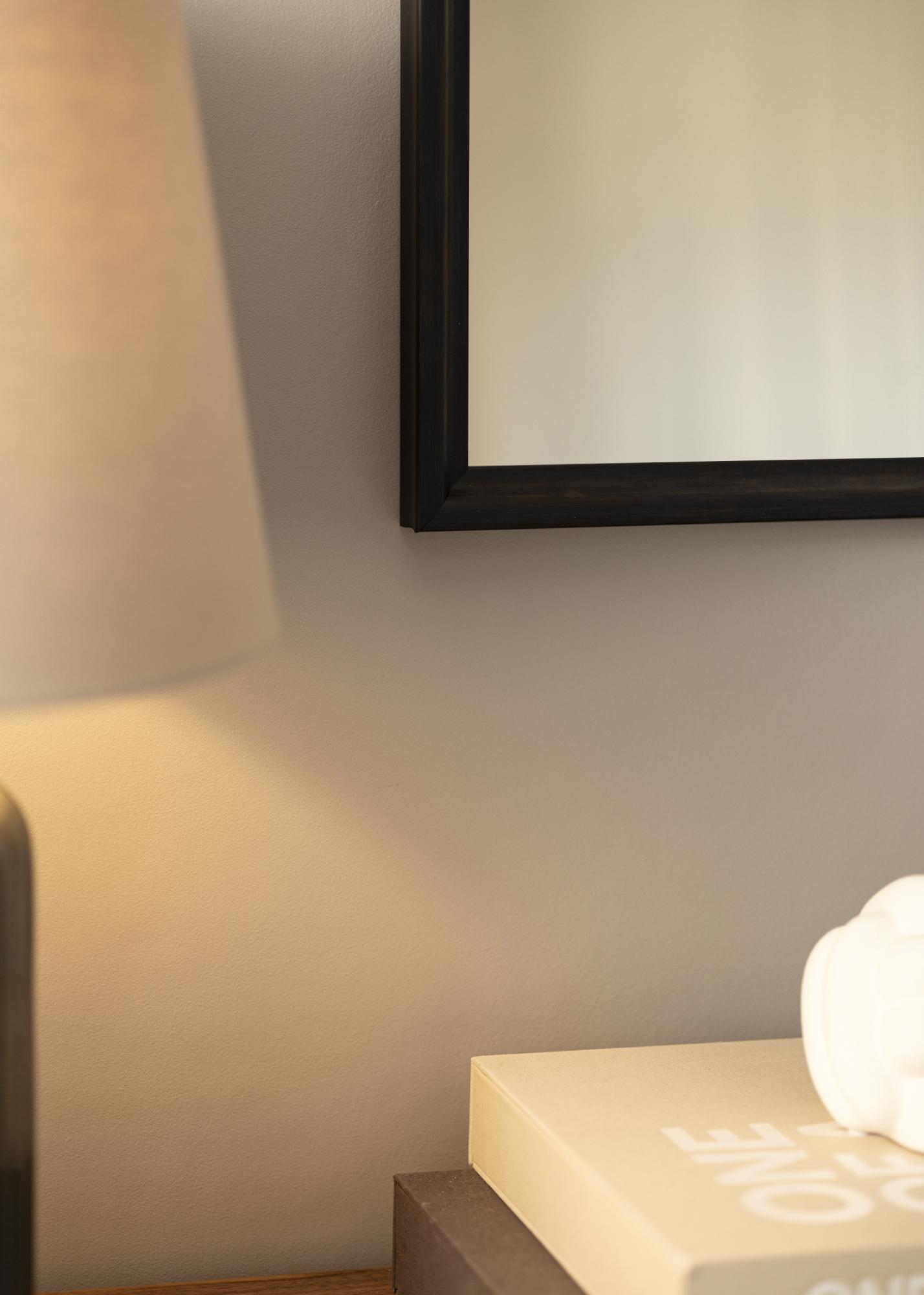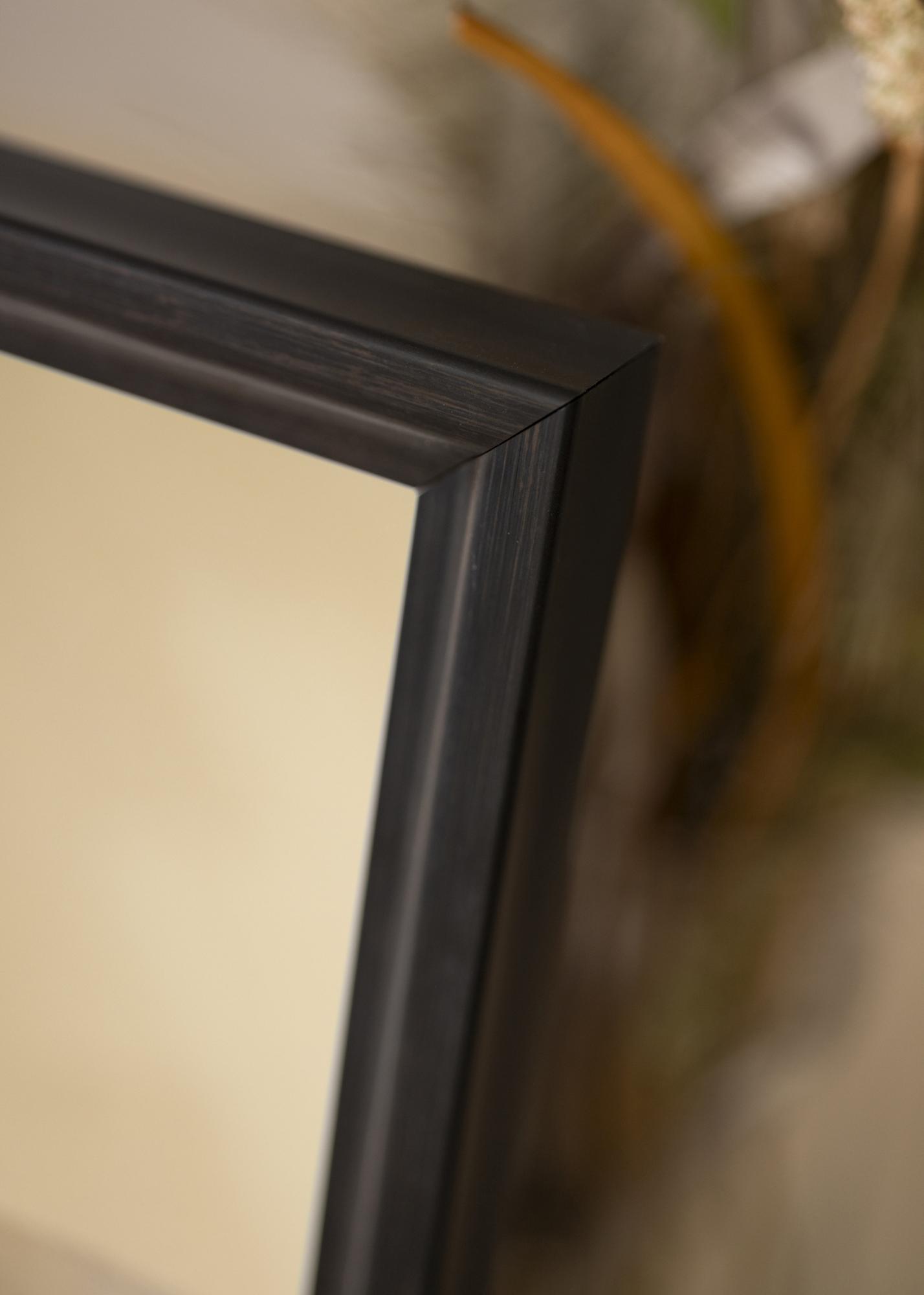 Perinteinen peilikehys tummissa mustan ja ruskean sävyissä. Väri on aavistuksen lähempänä mustaa kuin ruskeaa. Erinomainen valinta, kun etsit tummansävyistä mittatilauskokoista peiliä, jossa puun rakenne tuntuu ja näkyy. Se on tunnelmaltaan eläväisempi kuin kokomusta peili.