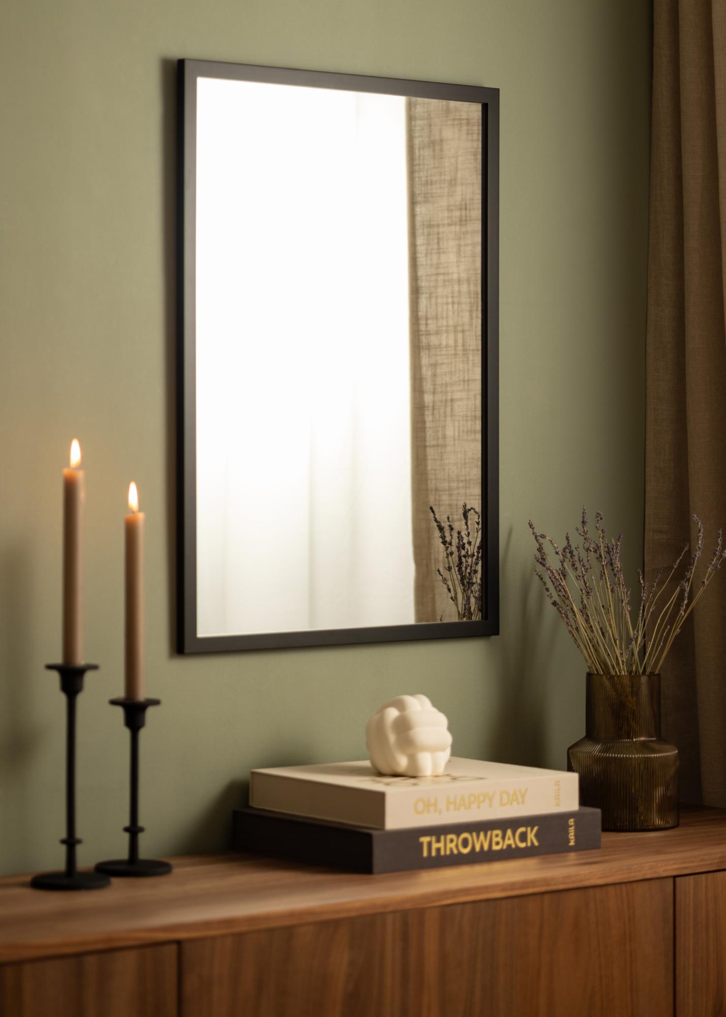 Black Wood on loistava valinta sinulle, joka etsit tyylipuhdasta seinäpeiliä, jossa on yksinkertainen musta kehys. Peili on valmistettu maalatusta ayospuusta ja varustettu värjäämättömällä peililasilla. 22 mm leveässä kehyksessä on perinteinen nelikulmainen profiili, joka ei vie huomiota pois itse peilipinnasta.