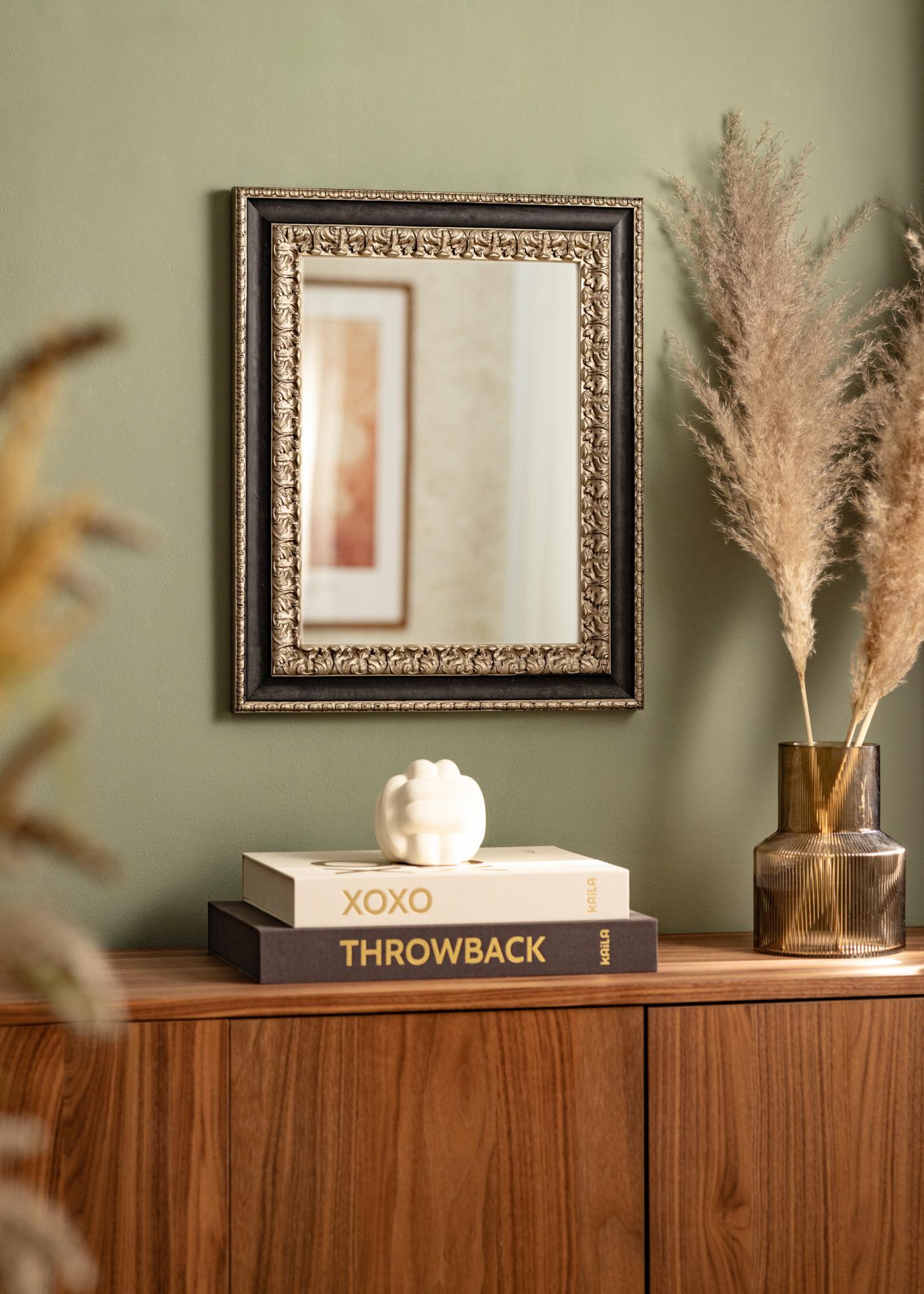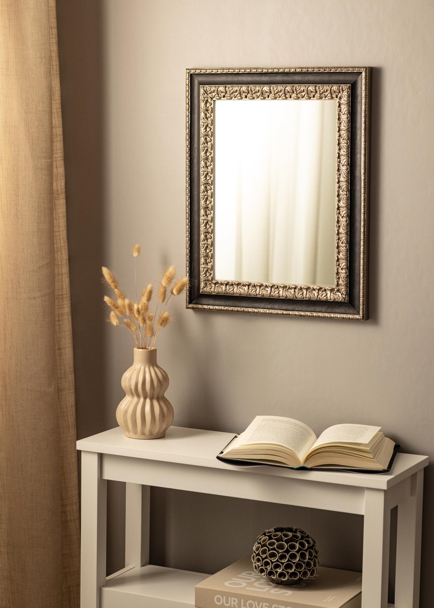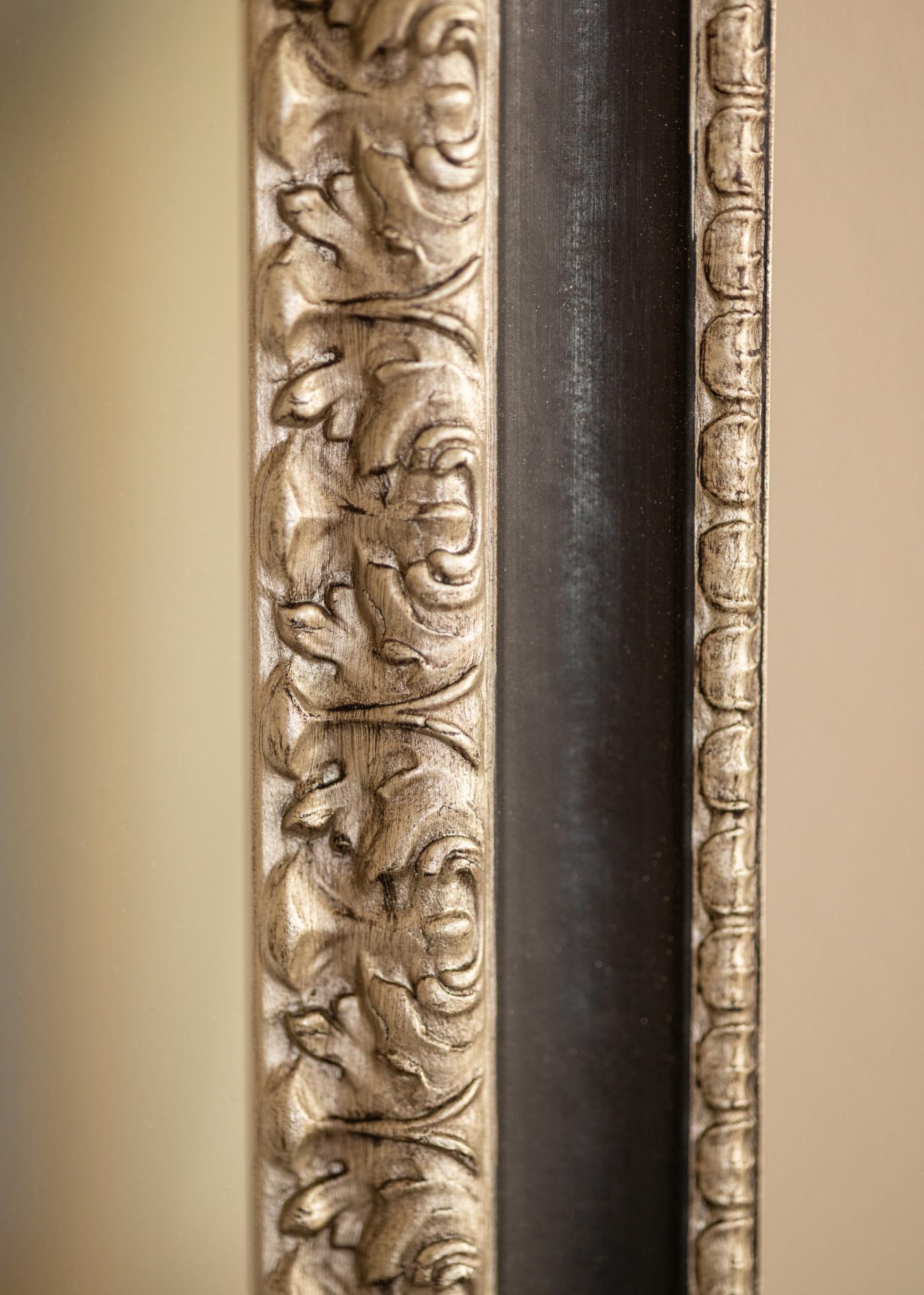 "Drottningholm Hopeanvärinen" on kaunis retrotyylinen peilikehys, joka on valmistettu Italiassa. Sen pinnassa ovat puunsyyt selkeästi näkyvillä ja peilin hopeansävyinen kehys on leveä, mikä antaa tuotteelle todella elegantin ilmeen.