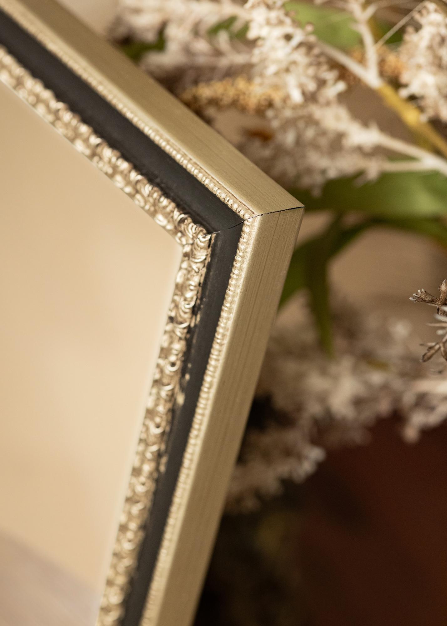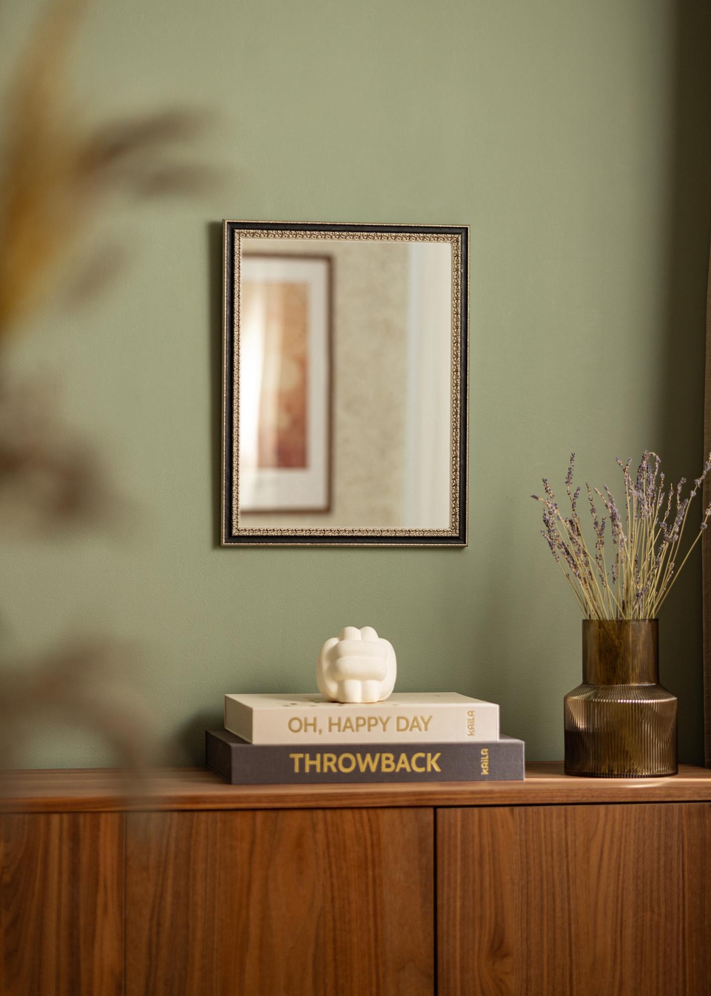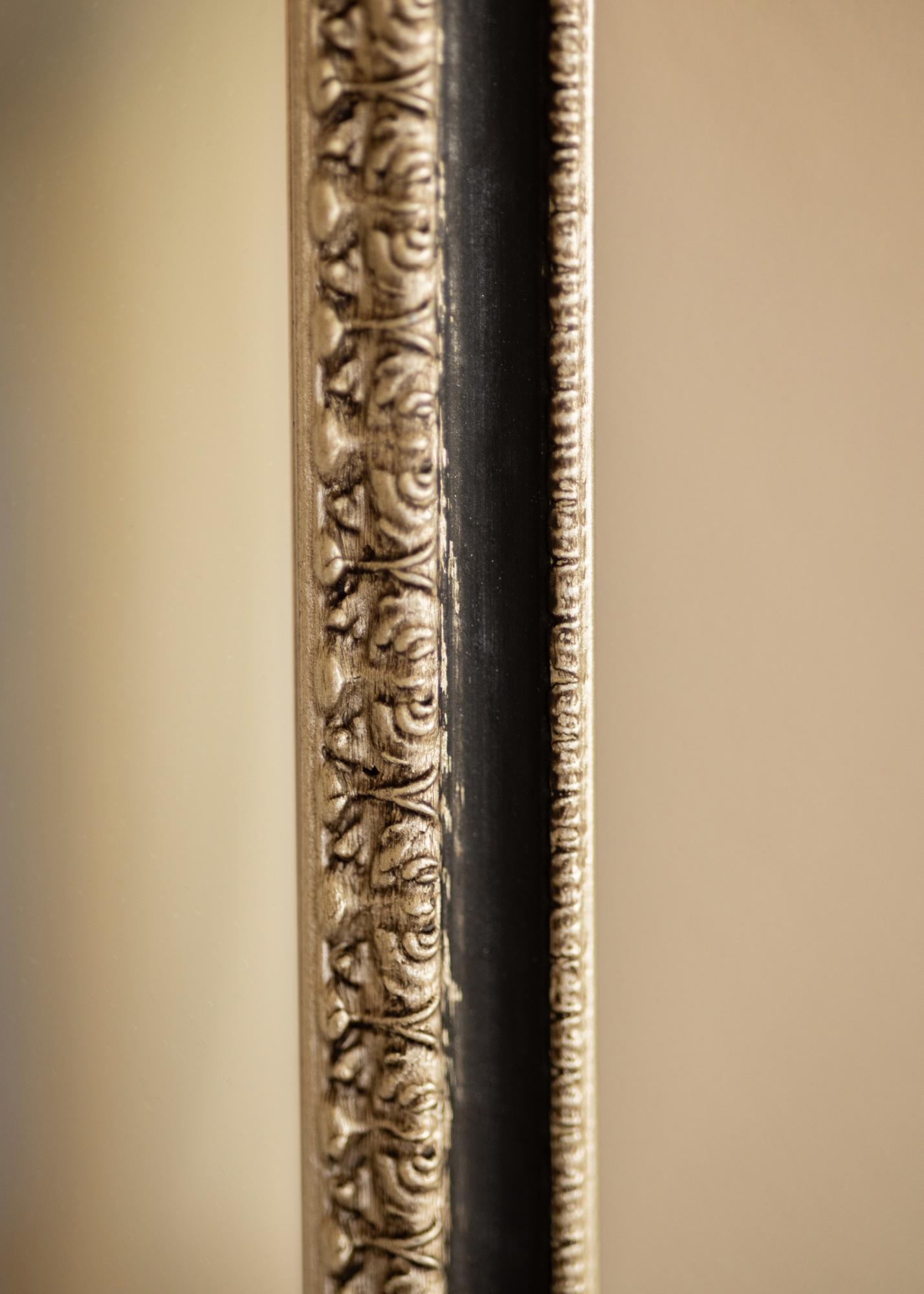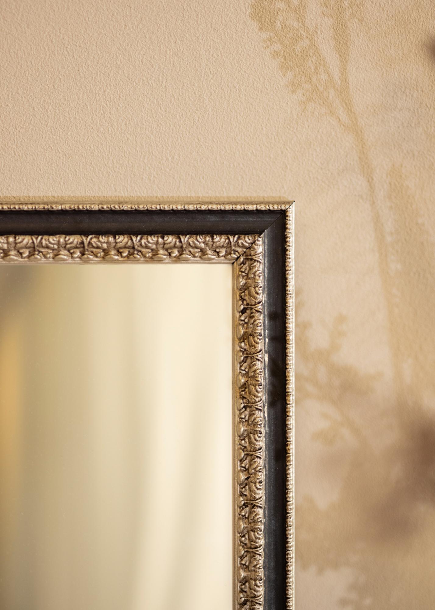 Kehys on valmistettu puusta ja siinä on antiikkikultainen viimeistely koristeellisilla ornamenteilla, jotka antavat peilille klassisen ja ajattoman tunteen. Yksityiskohtaiset koristeet korostuvat entisestään mustan reunan ansiosta, mikä luo harmonisen tasapainon antiikin ja modernin välillä.