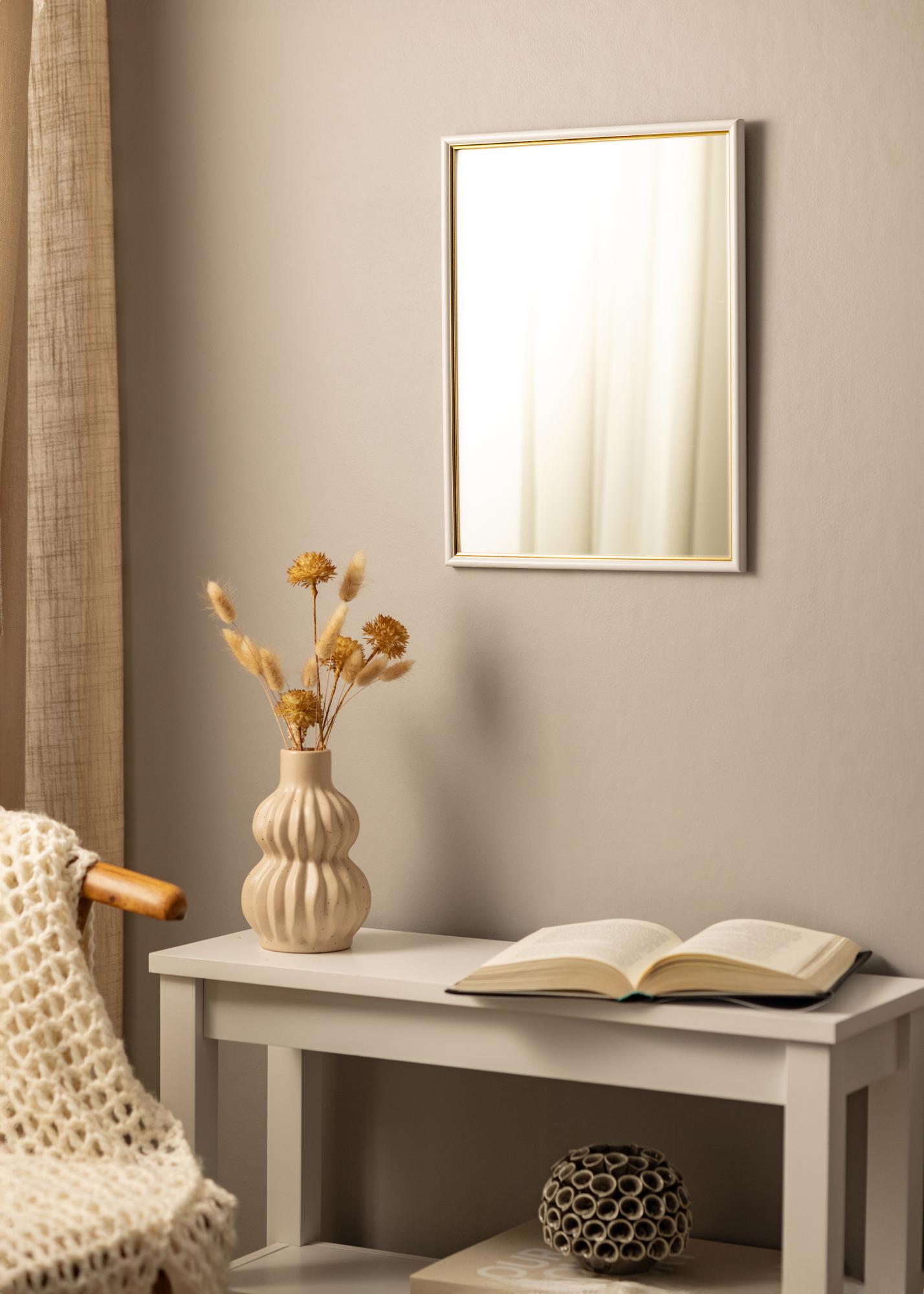 Käytä hillittyjä, ylellisiä yksityiskohtia aikaansaadaksesi tyylikkään kodin. Tämä mittatilauksena tehty peili valmistetaan kehysverstaallamme toiveidesi mukaan. Valkoisessa listassa on kullanvärin osa lähinnä lasia. Sopii erinomaisesti yhteen valkoisten, mustien, kullanväristen ja pastelliväristen sisustuskomponenttien kanssa!