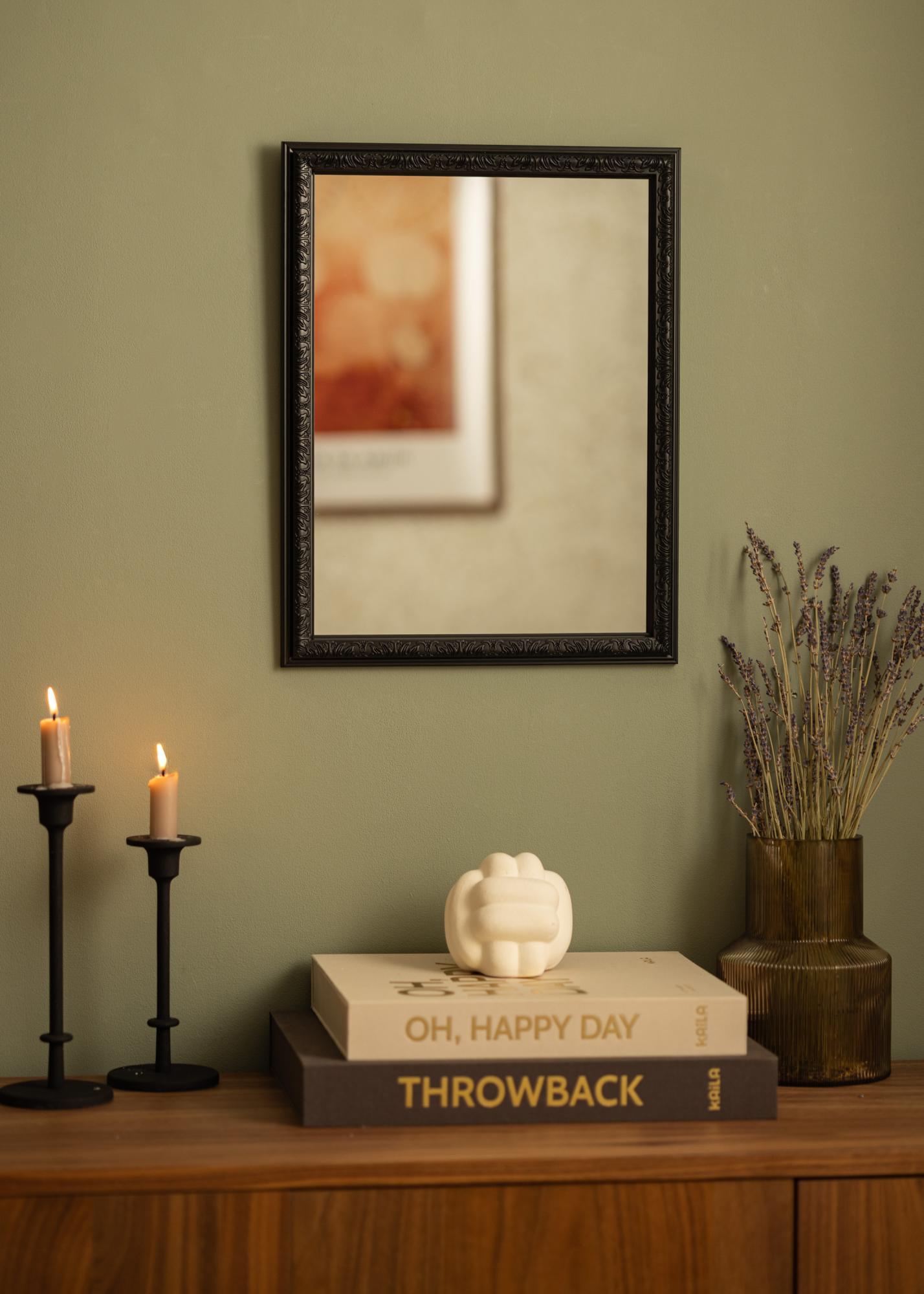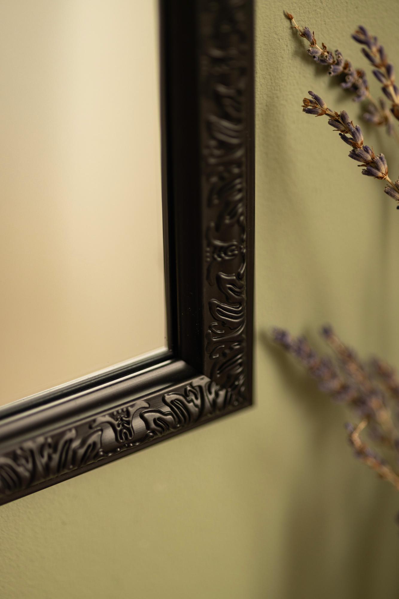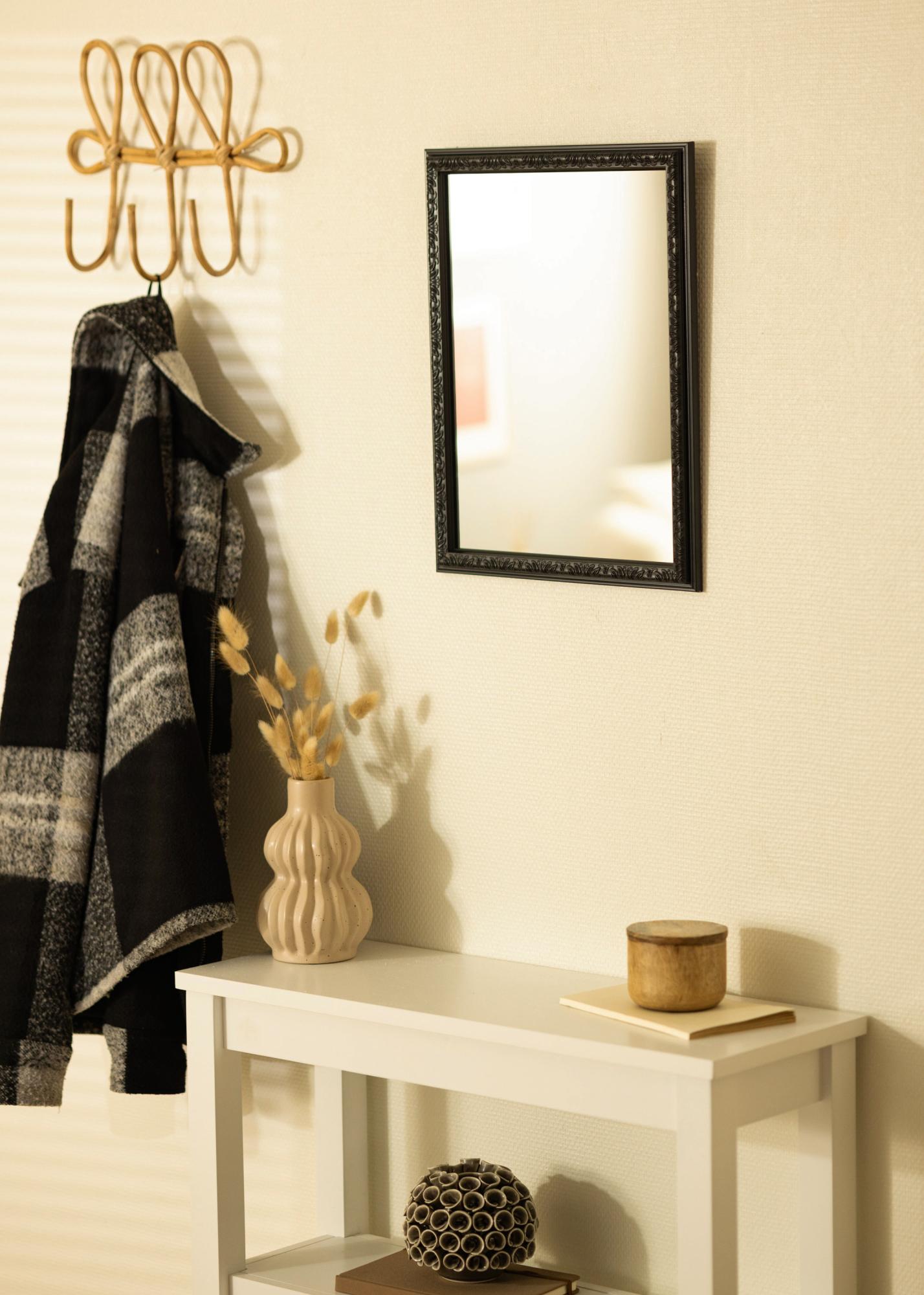 Käynnistä kehysvalitsin »Nost Musta on seinäpelisarjamme, jonka kehys on koristeltu epäsäännöllisillä merkeillä, mikä antaa peilille hieman mysteerisen ilmeen.