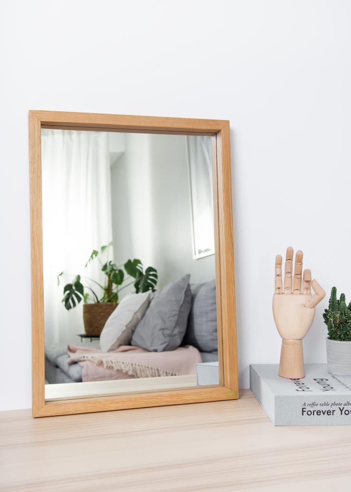 Suorakulman muotoinen peili tammikehyksellä - yksinkertainen ja ajaton muotoilu tuntuu sekä klassiselta että modernilta yhtä aikaan. Tälle peilille on helppo löytää sopiva paikka, joka huoneessa ja joka kodissa.