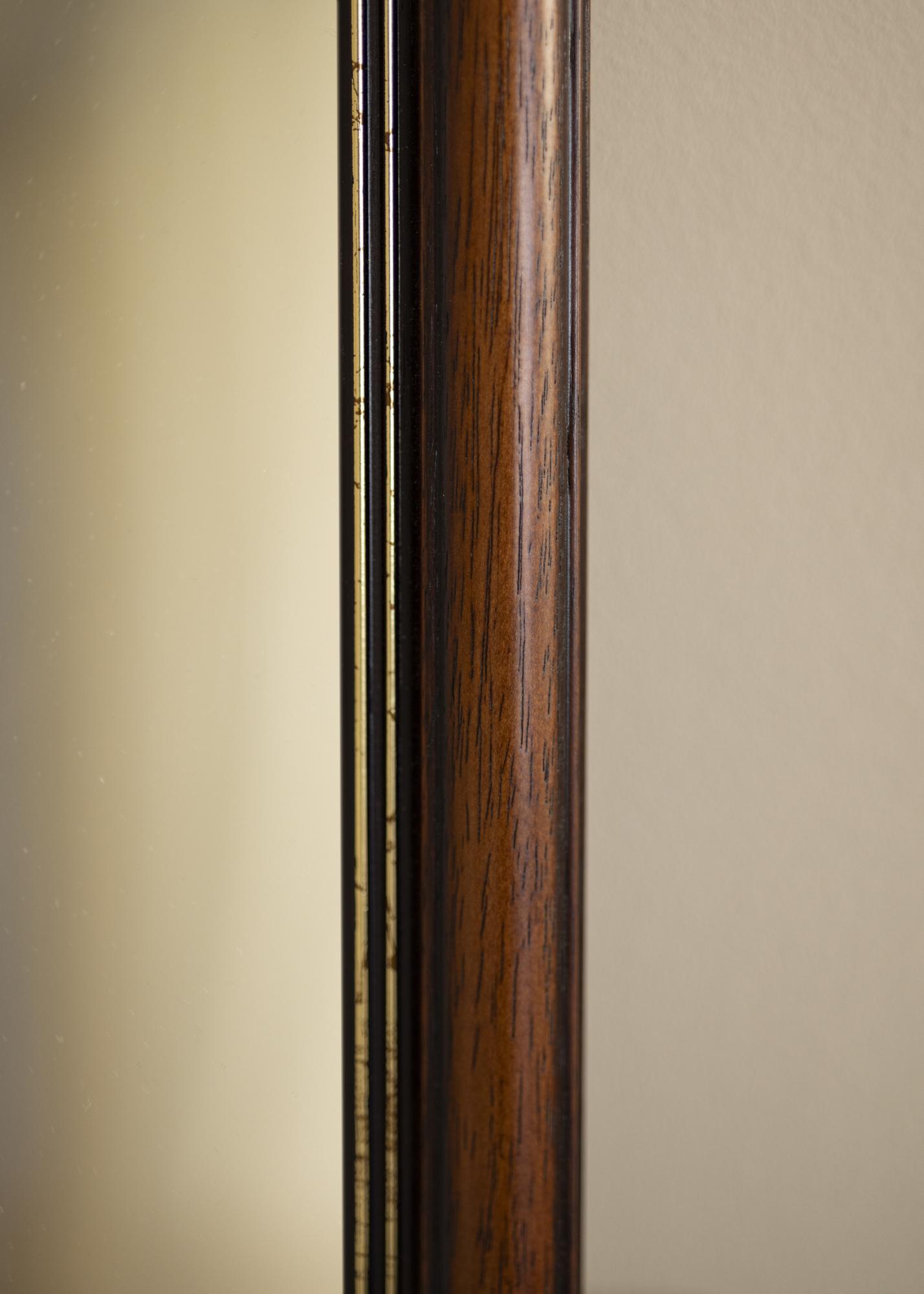Orsa on klassisen tyylinen ruskea peili, jossa on mustia koristeita yhdessä kullanväristen linjojen kanssa.