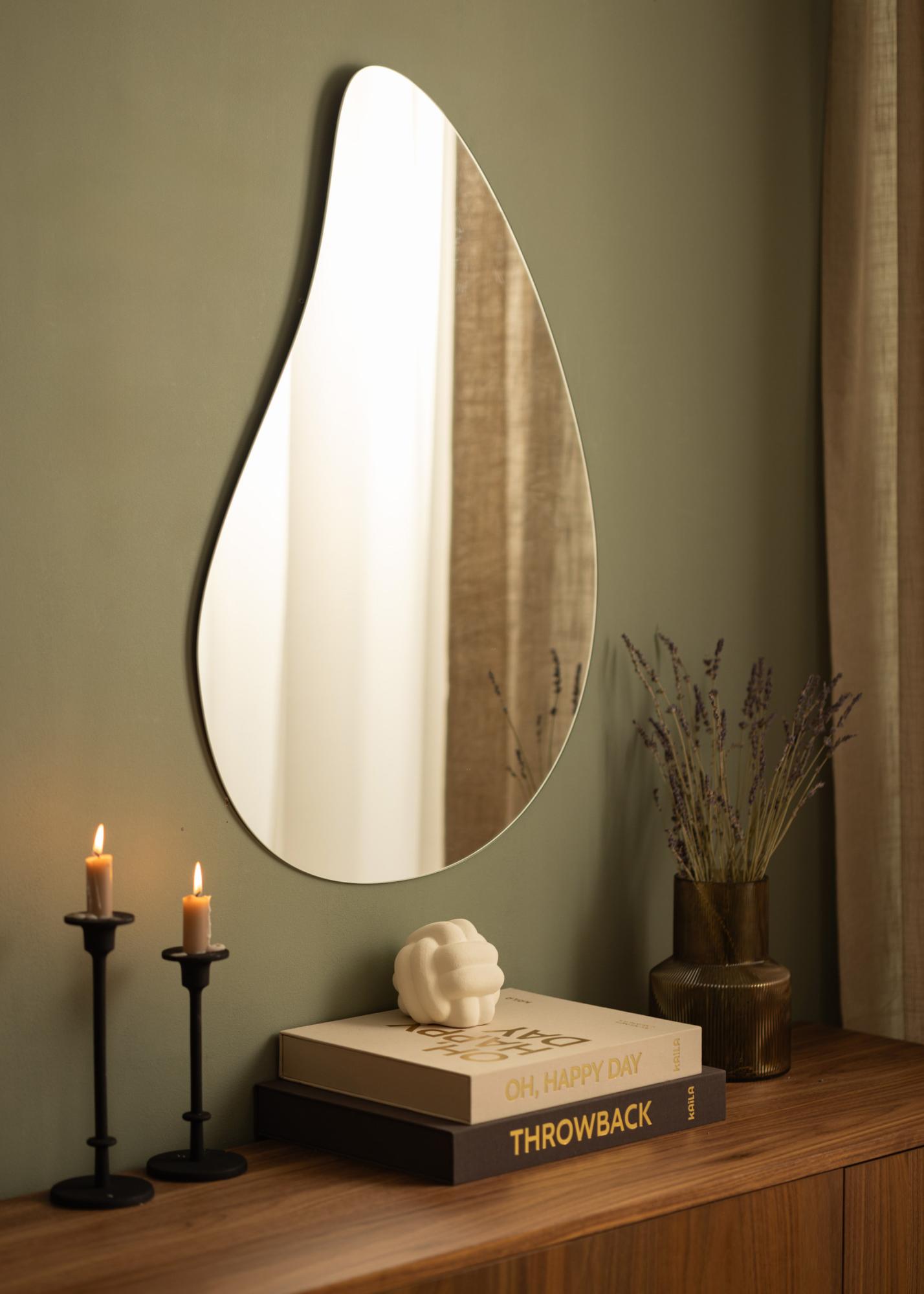 Tämä erittäin ohut peili on peräisin tanskalaiselta Incadolta ja sen peilipinta on kooltaan 60x41 cm. Pisaranmuotoinen peili antaa tyylikkään tunteen huoneessa, johon haluat sen ripustaa, ja se sopii kaikille, jotka ovat kiinnostuneita sisustamisesta ja trendeistä.