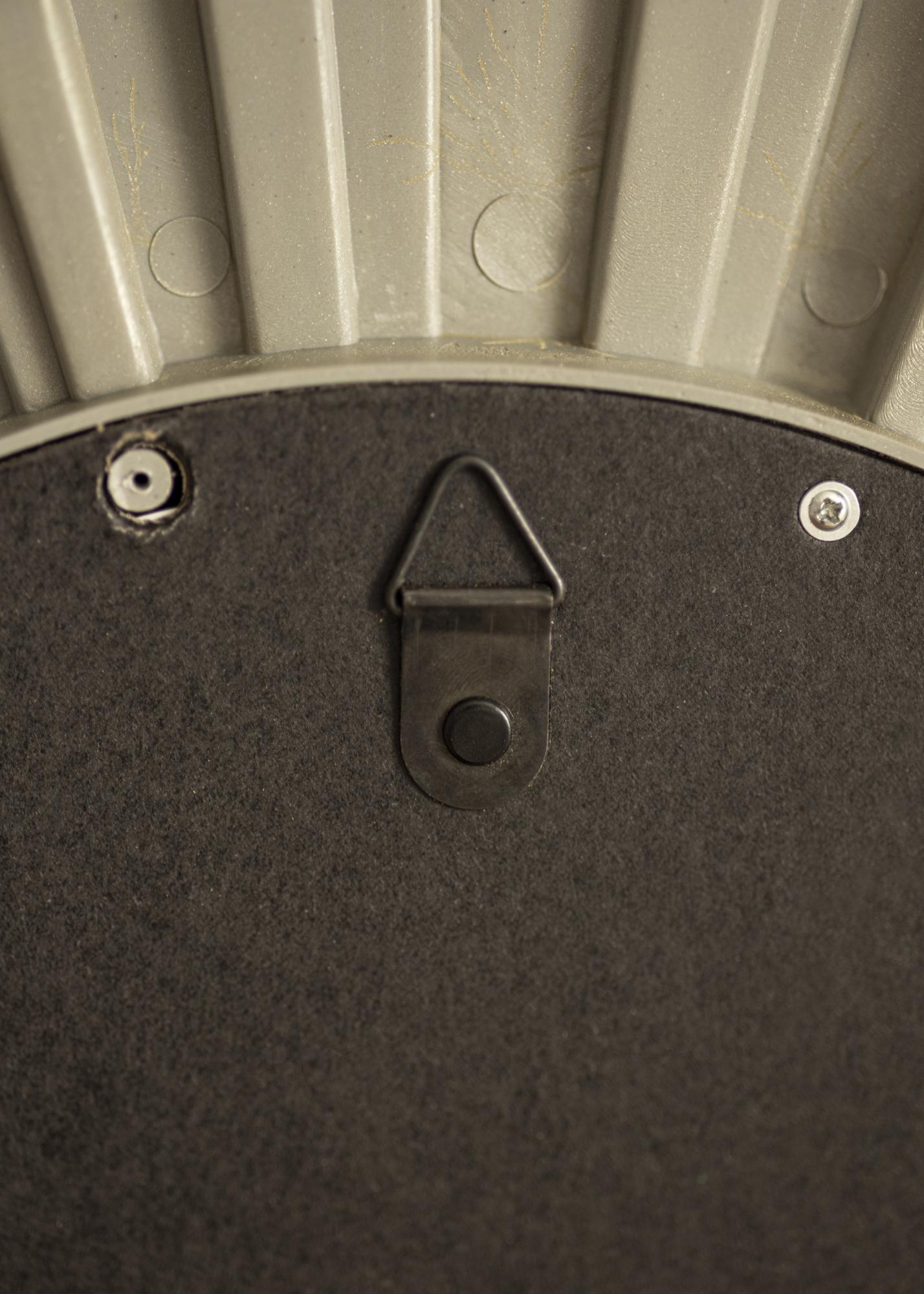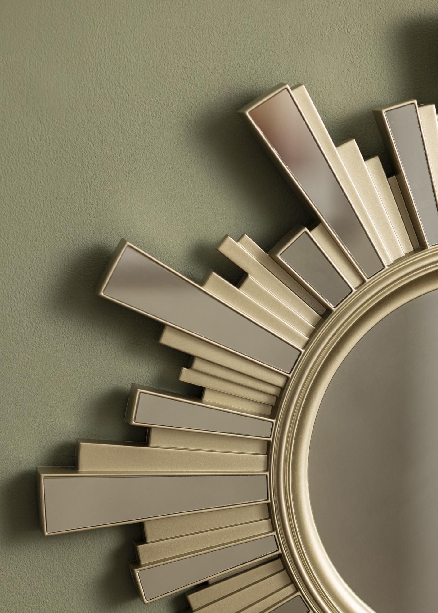 Tällä pyöreällä peilillä on oikein koristeellinen auringonmuotoinen kehys. Kehys on kullanvärinen, mikä antaa peilille tyylikkään ja selkeän vaikutelman.