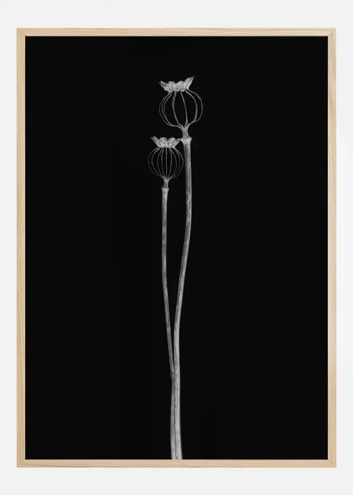 Yksinkertainen luontojuliste kahdesta vanhasta unikosta upealla mustalla taustalla. Tämän kuvan voimakkaat kontrastit saisivat erinomaisen vaikutuksen, kun se yhdistettäisiin kirkkaan väriseen seinään.