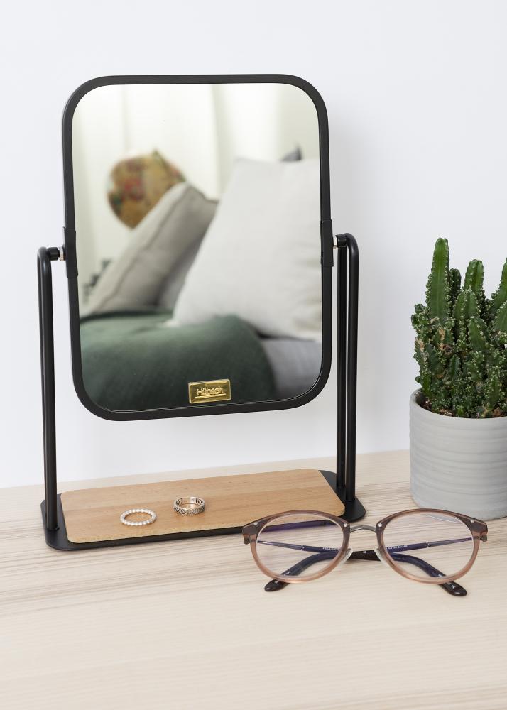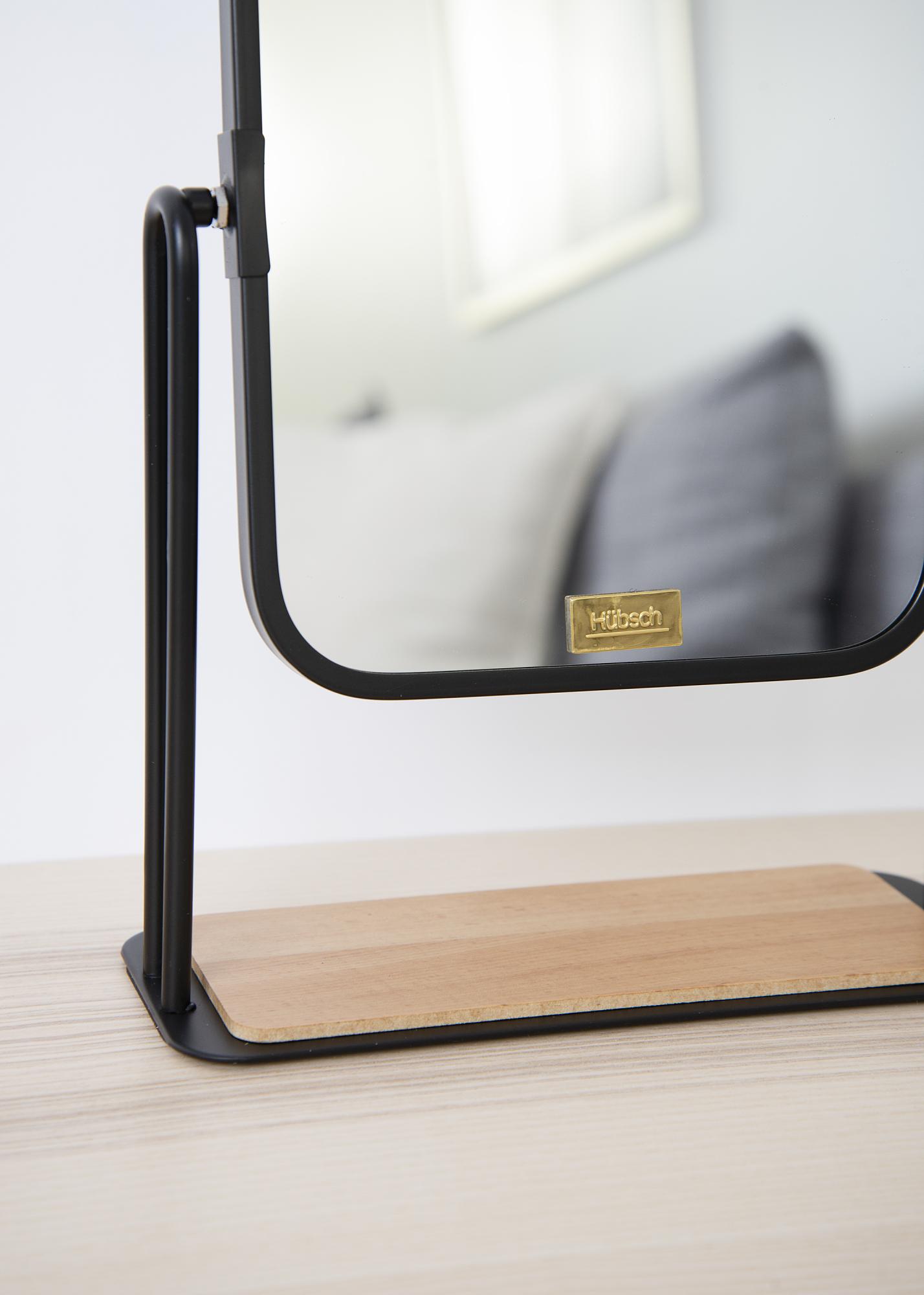 Tämä pöytäpeili on sekä hieno että käytännöllinen - monella tavalla. Peili on suorakulman muotoinen ja siinä on ohut ja hillitty musta metallikehys. Tuen alaosassa on pieni puutarjotin johon voi helposti laittaa pienet tavarat.