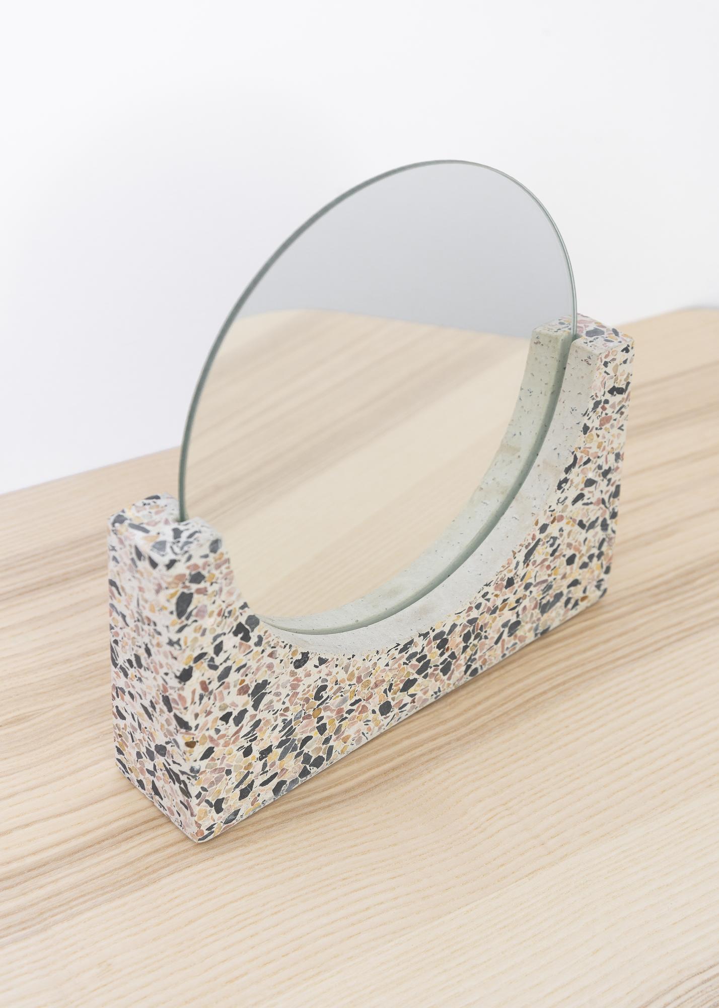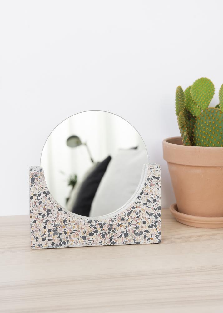 Tämä pyöreä pöytäpeili on melkein taideteos! Tämä peili ei ole vaan käytännöllinen vaan sen tyylikäs ja vahva tuki valkoisesta Terrazo-tekokivestä tekee tästä peilistä hyvin erikoisen. Se on hieno sisustusyksityiskohta joka lisää modernia muotoilua jokaiseen huoneeseen minne sen sijoitat.