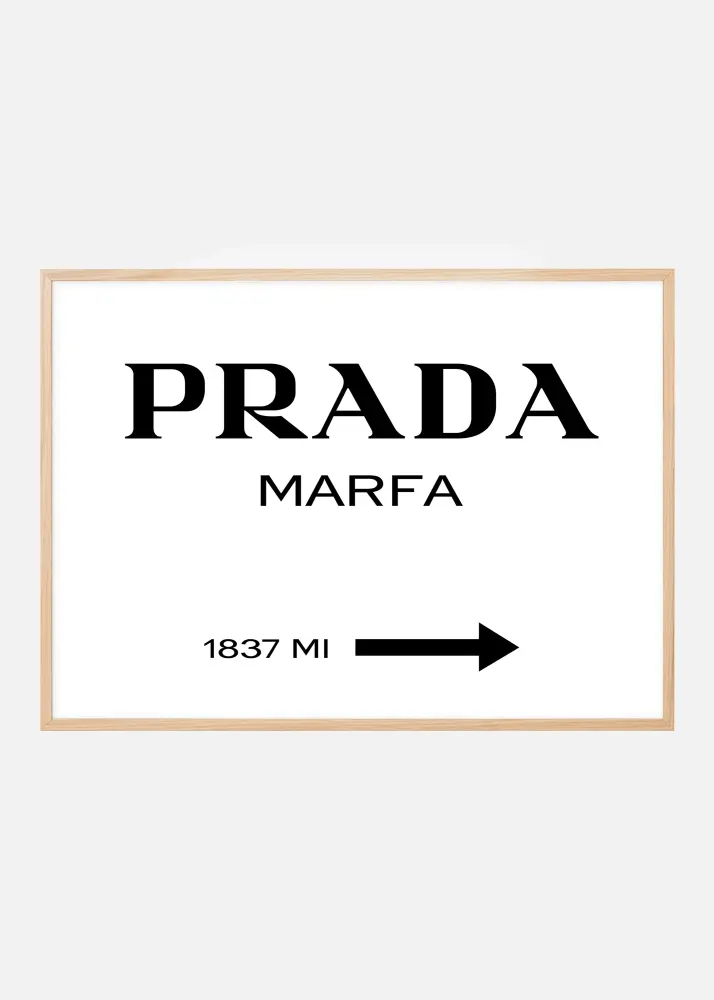 Juliste, jossa on opaste pysyvään taideteokseen Prada Marfa, jonka ovat luoneet taiteilijat Elmgreen ja Dragset. Asennus vihittiin käyttöön ensimmäisenä lokakuuta 2005 ja sen on tarkoitus muistuttaa Pradan myymälää. Mustavalkoinen painatus sopii yhtä hyvin taiteen ystävän kotiin kuin muodin maailmasta pitävälle ja sitä voi hyvin yhdistää muiden graafisten motiivien julisteiden kanssa. Täydennä yksinkertaisella mustalla tai valkoisella valokuvakehyksellä, joka antaa tekstin puhua ja joka sopii useimpiin ympäristöihin.