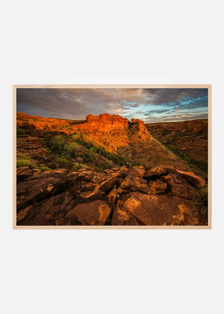 Valokuvajuliste, jossa on karuja, auringonlaskun punaisiksi värjäämiä vuoria. Juliste sopii niille, jotka pitävät aavikko- ja kalliokuvista seinillään. Lämpimät punaiset sävyt jäänsinistä taivasta vasten ja kuvan syvyys tekevät aiheesta mielenkiintoisen. Kehystä juliste tyylikkäällä valokuvakehyksellä ja aseta seinällesi kuva autiomaasta.Valokuva tulostetaan Hahnemuhle Photo Luster 260 gramman paperille.Kehys ei sisälly tuotteeseen, mutta sen voi tilata erikseen.
