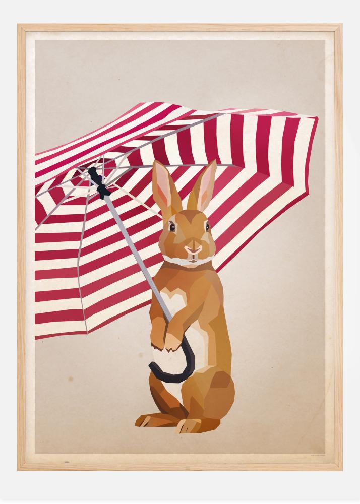 Söpö taideteos, jossa kani pitää sateenvarjoa kahden etutassunsa välissä. Ruskeavalkoinen kani on sijoitettu beigeen taustaan, ja sillä on punavalkoinen sateenvarjo. Jäniksen silmät katsovat suoraan kameraan, joten tämä on täydellinen kuva lapsen makuuhuoneeseen.