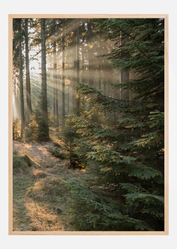 Ihastuttava metsäkuva. Auringonlaskun loistaessa lehtien läpi maahan, sitä ympäröivät pienemmät puut. Tämä luonnonkaunis maisema luo lauhkean tunnelman, ja ympäristö on rentouttava ja hillitty. Sopii täydellisesti vihreään olohuoneeseen.