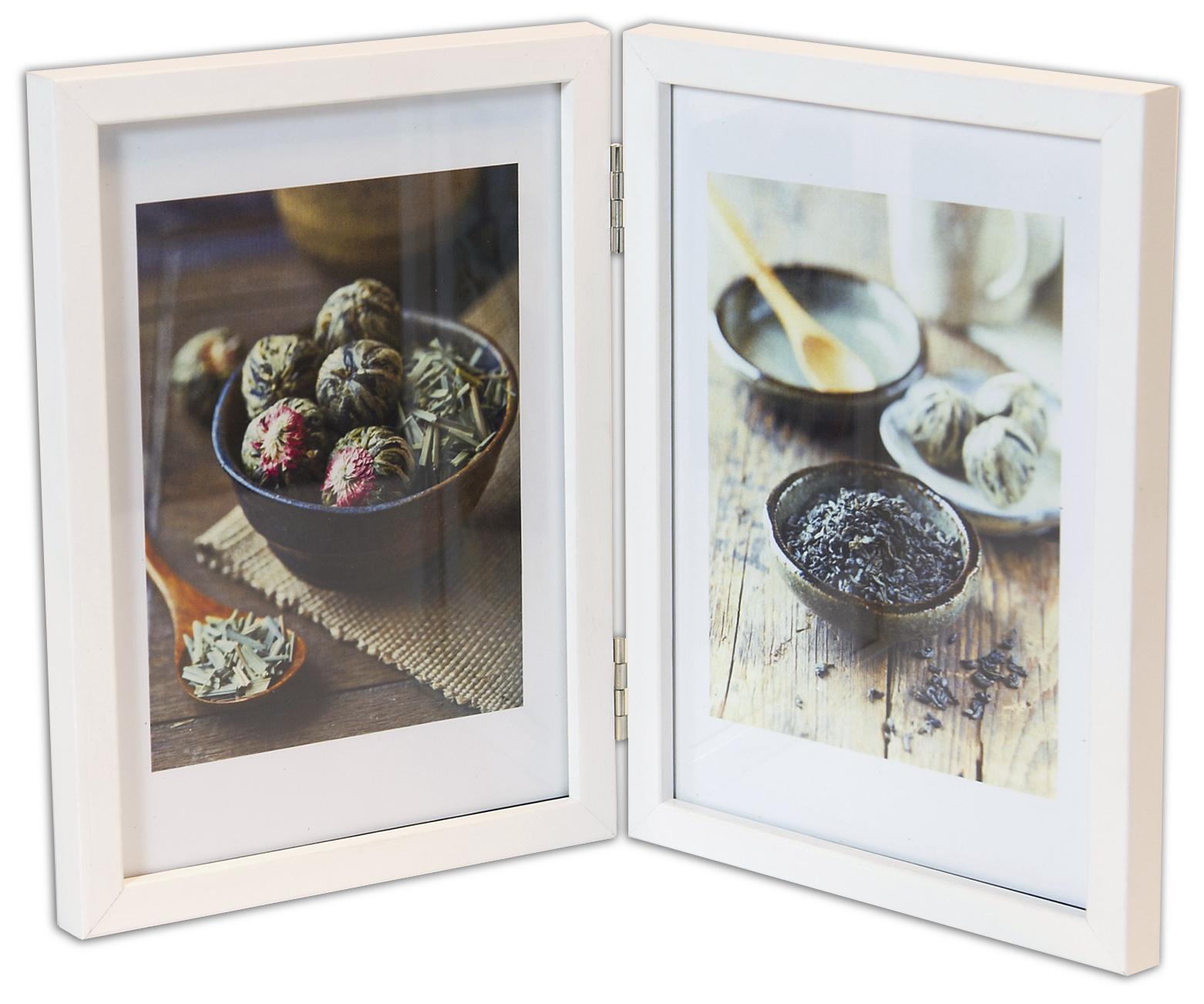 Rock Valkoisessa Taittokehyksessä on tilaa kahdelle valokuvalle. Kehyksessä on nelikulmainen moderni puinen malli, joka on viimeistelty valkoisella lakkauksella.