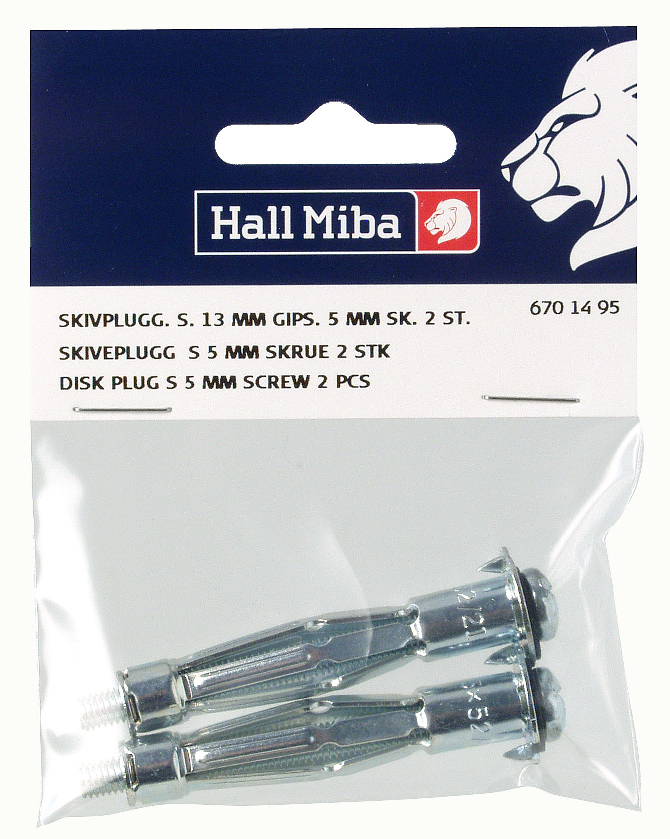 Sku:2-osaiset tulpat ja M5-ruuvit 13 mm kipsiseinälle. Tulppaan sopii 8 mm ruuvi.