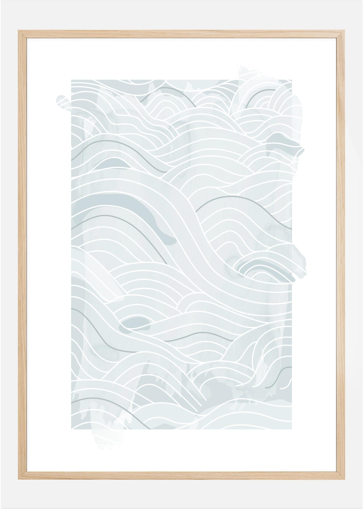Merijuliste, jossa on pehmeän sinisiä abstrakteja viivoja ja aaltoja valkoisella pohjalla. Sinisen eri sävyt ja eri paksuiset viivat muodostavat yhdessä nämä aaltoilevat aallot sivun poikki. Anna ajatustesi vaeltaa ja tempautua mukaansa tämän pehmeän merijulisteen avulla.