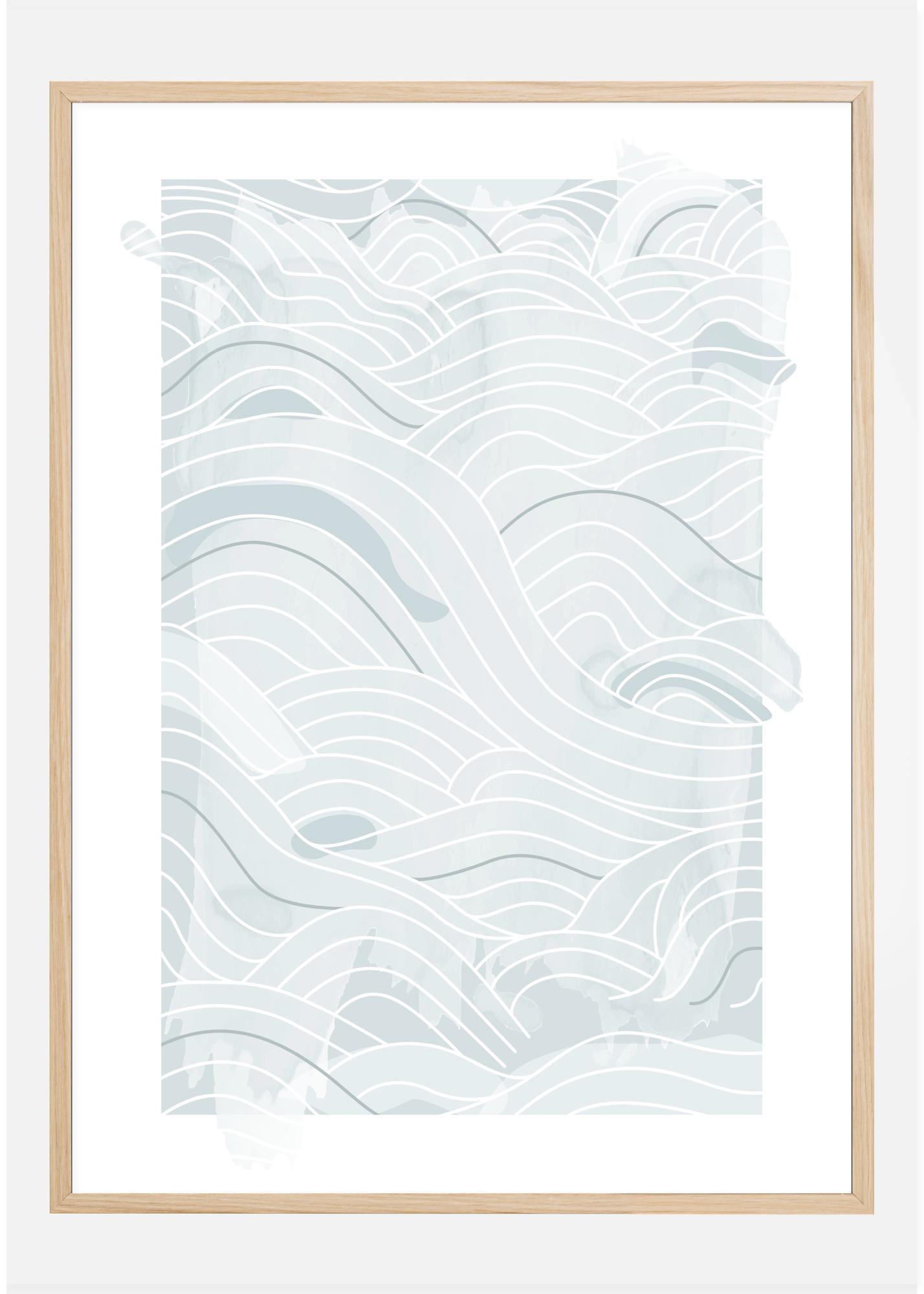 Merijuliste, jossa on pehmeän sinisiä abstrakteja viivoja ja aaltoja valkoisella pohjalla. Sinisen eri sävyt ja eri paksuiset viivat muodostavat yhdessä nämä aaltoilevat aallot sivun poikki. Anna ajatustesi vaeltaa ja tempautua mukaansa tämän pehmeän merijulisteen avulla.