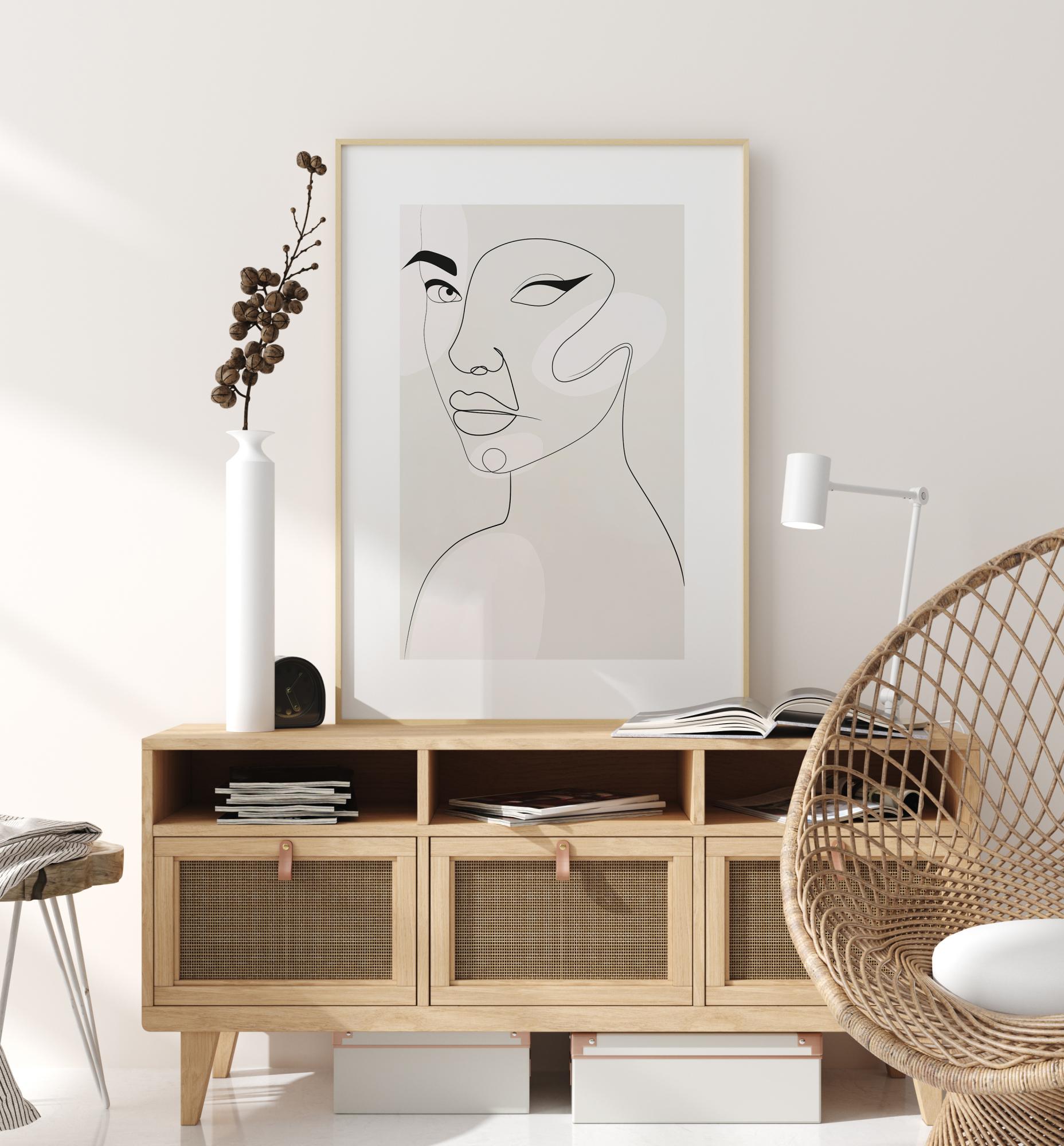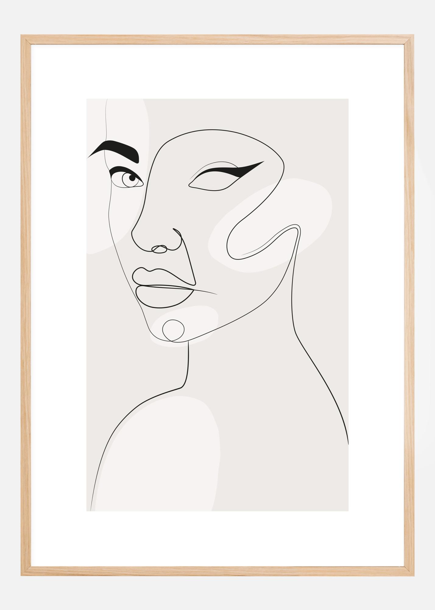 Modernistinen juliste abstraktista naisen kasvoista. Ohuet, pyöreät viivat luovat naisen kasvot. Yksi silmä tuijottaa sinua vahvalla yksityiskohdalla. Toinen on epätäydellinen, mutta siinä on kaunis silmämeikki. Naisella on ylimielinen ilme, kun hän katsoo sinua tässä elegantissa minimalistisessa teoksessa.