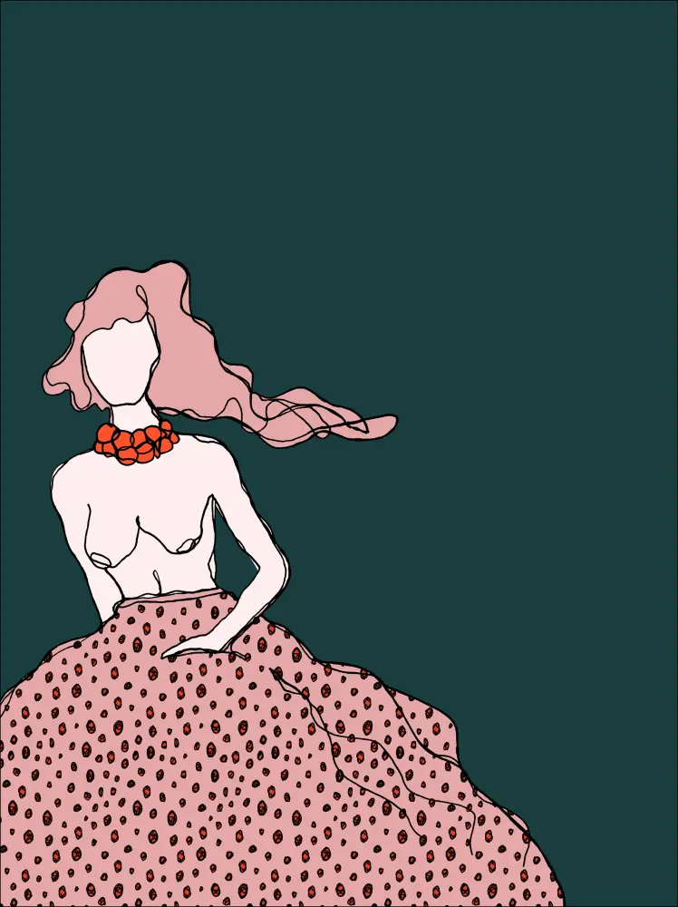 Hauska juliste naisesta sinivihreällä taustalla. Nainen on yläosattomissa, ja suuri pilkullinen vaaleanpunainen hame pullistuu. Hänen vaaleanpunaiset hiuksensa leijailee sivuttain näkymättömän tuulen puhaltamana. Kirkkaan oranssit helmet koristavat hänen kaulaansa. Käsi taskussa, tässä naisen luonnoksessa on liikettä ja rento tunnelma, joka sopii täydellisesti vaivattoman hillitylle seinälle.