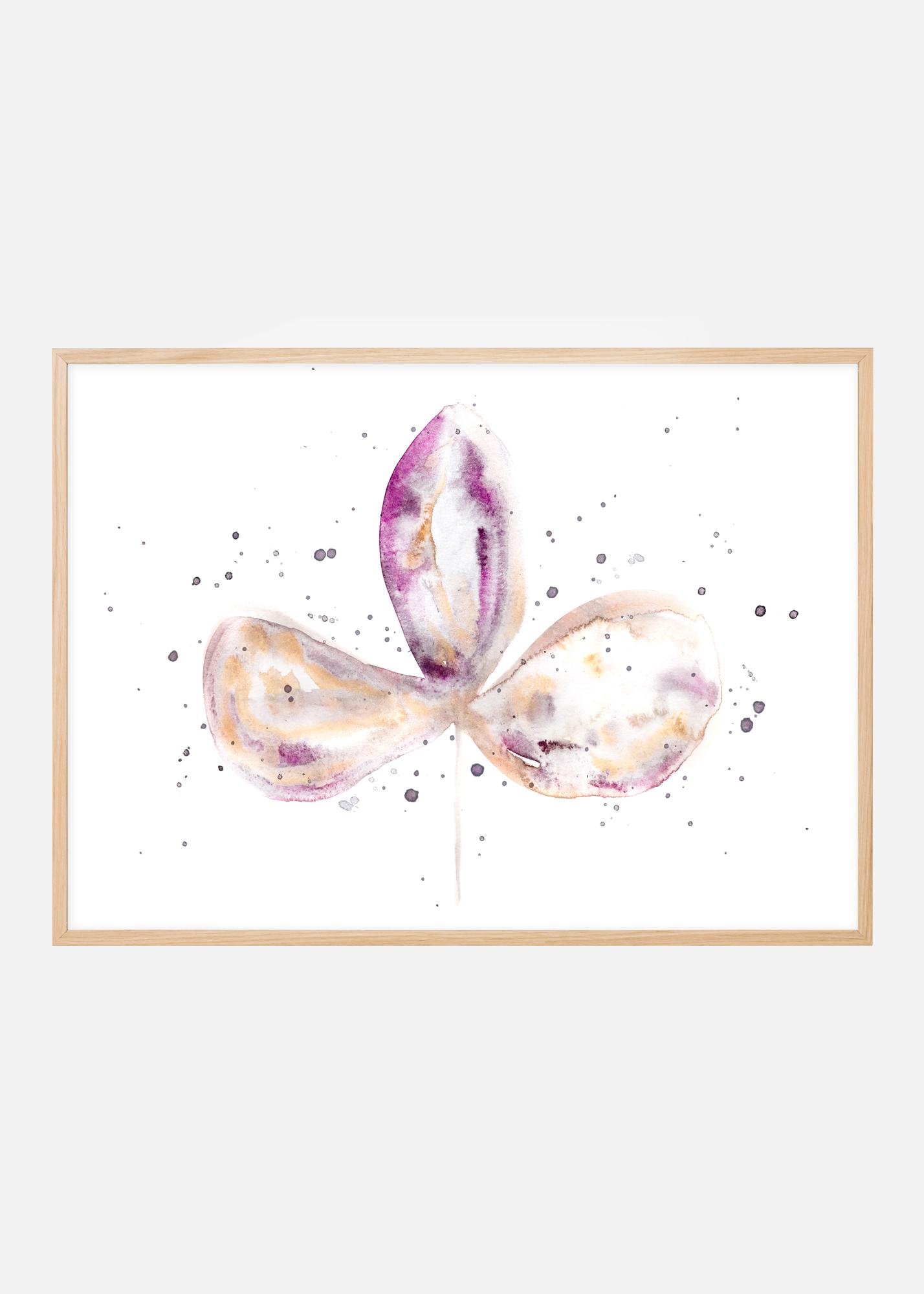 Kirkas juliste kolmesta violetista terälehdestä valkoisen taustan keskellä. Erilaiset violetit sävyt luovat nämä pehmeät laajenevat lehdet. Violetit maalipisteet pursuavat lehdistä ja luovat abstraktin tunnelman. Tuo värit esiin ripustamalla tämä lilalle seinälle.