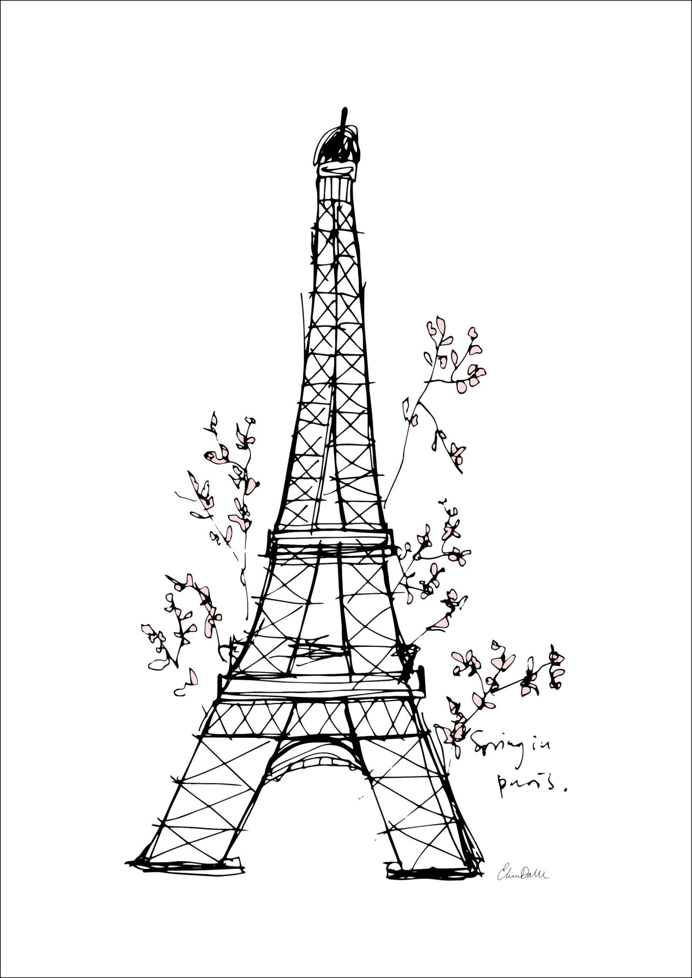 Maamerkkijuliste, jossa on yksinkertainen tussipiirros Eiffel-tornista. Kuvan raapaistut viivat ja tornin epäkeskinen kallistus antavat kuvituksellisuutta. Suuret kukkivat oksat levittäytyvät tornin taakse antamaan keväisen Pariisin tunnelman.