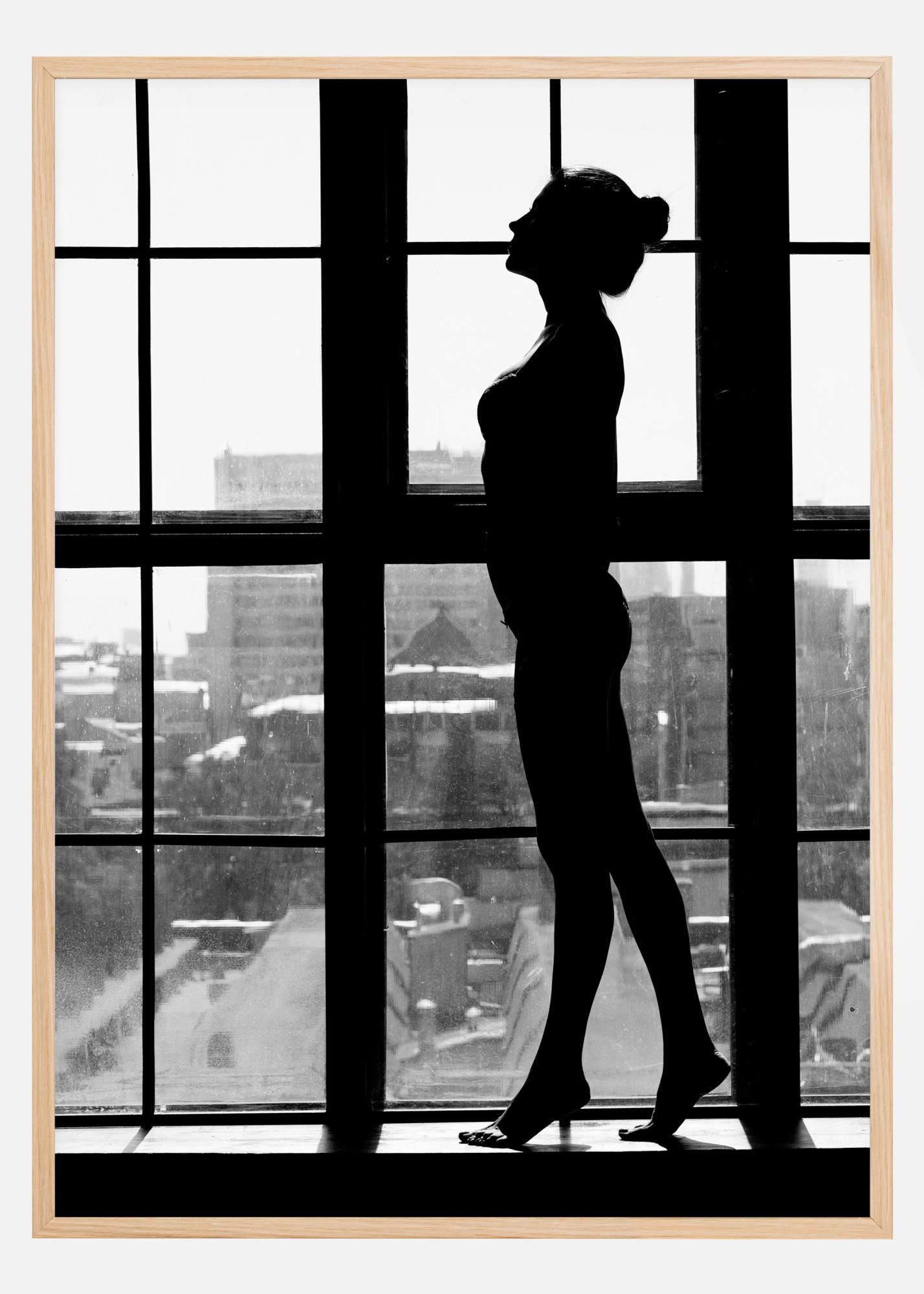 Fotografinen taide harmaasävyissä naisesta, joka seisoo suuressa teollisuusikkunassa. Vastavalo muuttaa naisen tummaksi siluetiksi kaupunkia vasten. Tyylikäs juliste, täydellinen yhdistettäväksi muiden suosikkien kanssa suuremmalle tauluseinälle.