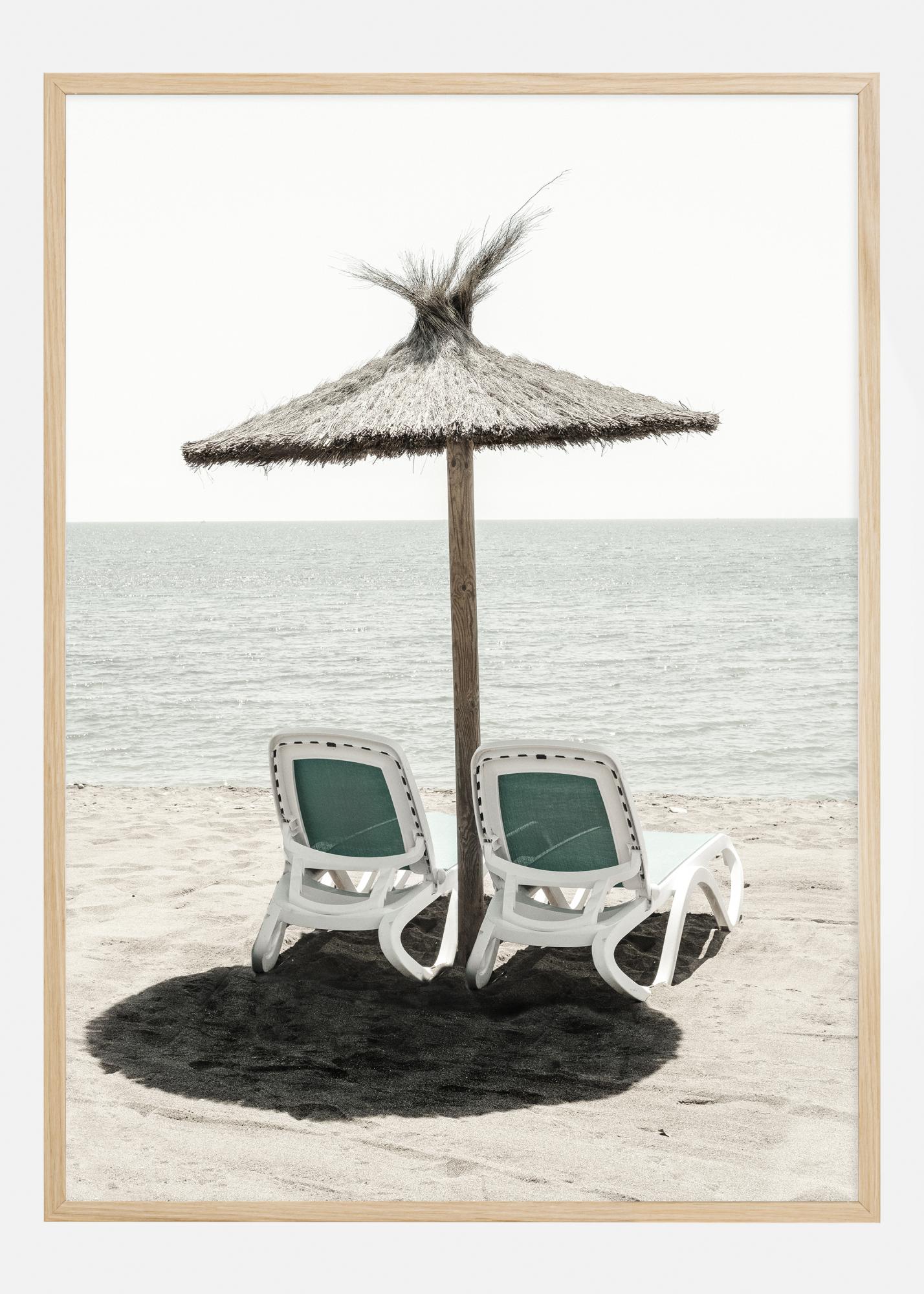 Haaveile aaltojen äänestä ja auringonlämmittämän hiekan tunteesta tämän rauhoittavan julisteen avulla. Kaksi tyhjää aurinkotuolia olkivarjon alla odottaa kutsuvasti rannalla, meren horisontti taustalla. Tämä rauhallinen näkymä on ilmentymä rentoutumisesta ja pakomatkasta arjesta.