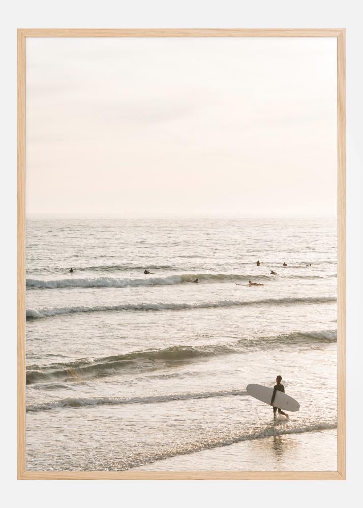Juliste laajasta merialueesta, joka on täynnä surffaajia odottamassa seuraavaa suurta aaltoa. Pienet päät keikkuvat kaukana meressä, kun viimeinen surffaaja alkaa surffata laudan kanssa. Meri on tyyni pehmeässä aamuvalossa, ja ilmassa on odotuksen tuntua.