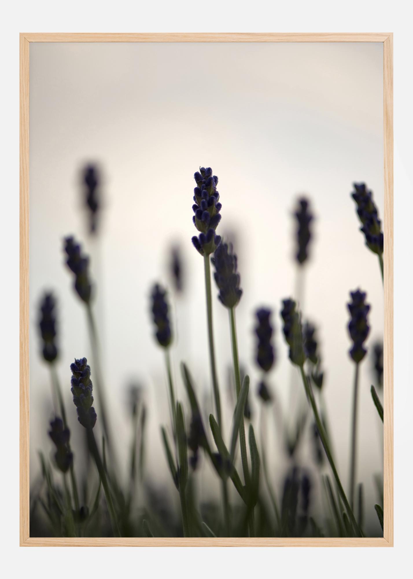 Kukkajuliste, jossa on lähikuva laventelikukista pellolla. Katso tarkkaan, niin näet violetit nuput heilumassa vihreiden varsien yläosassa. Ne seisovat korkealla yksinkertaista valkoista taustaa vasten, ja ne ovat täydellinen lisä värikkääseen huoneeseen.