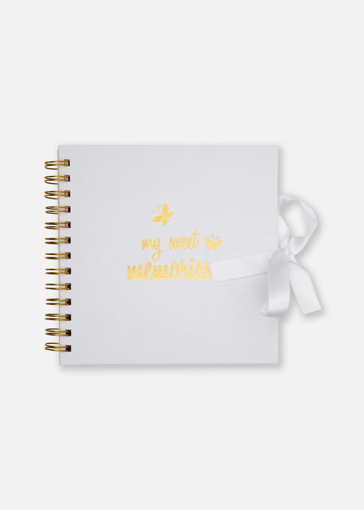 Suloinen kierresidottu albumi, jonka voit sitoa kiinni valkoisten nauhojen avulla. Täydellinen albumi kaikkien hienoimpien muistojesi säilyttämiseen! Etupuolella painettu kultainen teksti "My sweet memories" perhosten kera. Albumissa on 24 happovapaata valkoista arkkia (48 sivua).