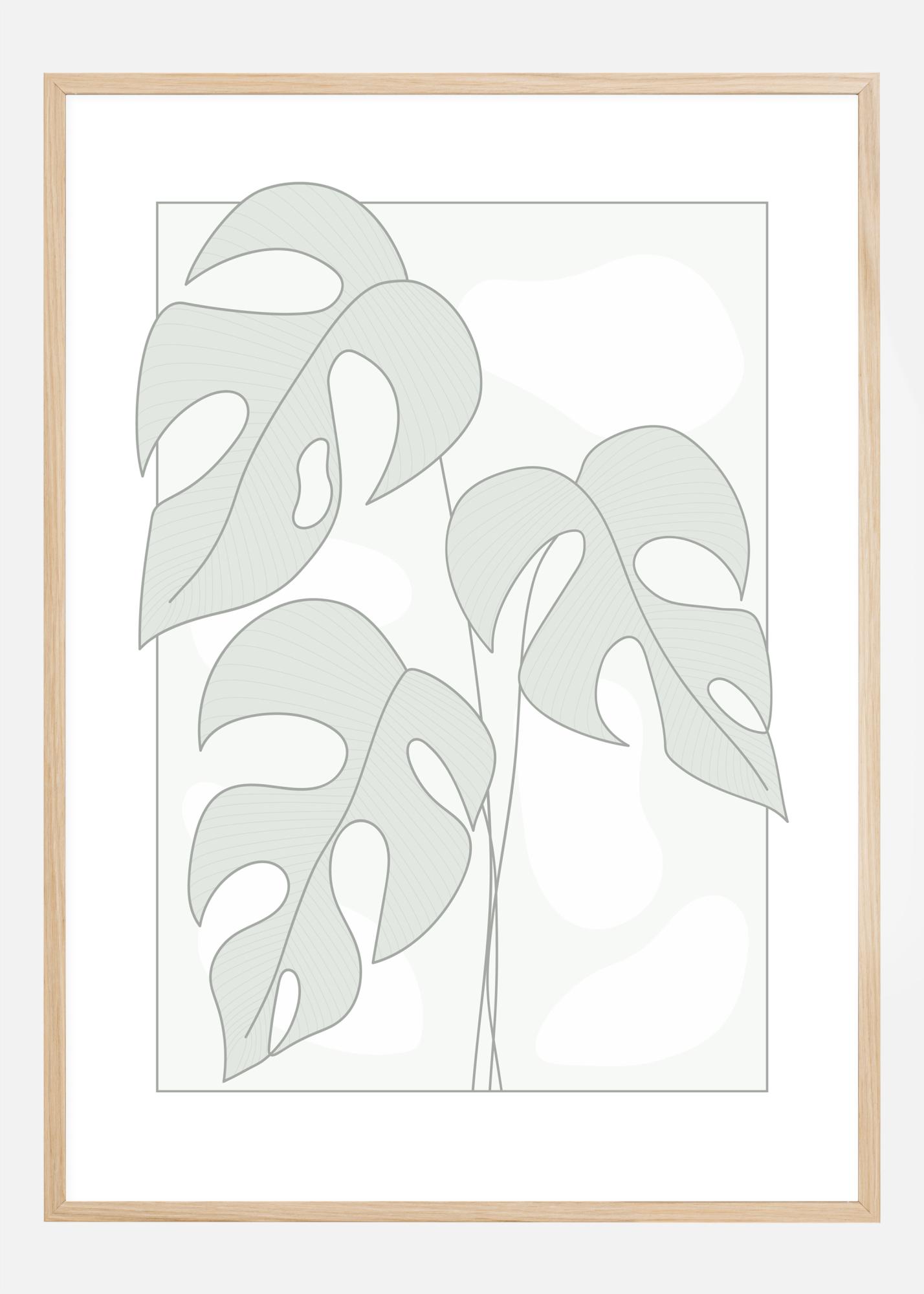 Yksinkertainen juliste, jossa on havainnollistavia jättipeikonlehden lehtiä. Kolme suurta lehteä täyttää kuvan, joista jokainen on pehmeän harmaan sävyinen. Ohuet viivat muodostavat varret, kun nämä tyylikkäät lehdet, joissa on reikiä, roikkuvat tässä kuvassa alaspäin. Pidä asiat hillittyinä ripustamalla se pehmeän vihreälle seinälle luonnollista tunnelmaa varten.