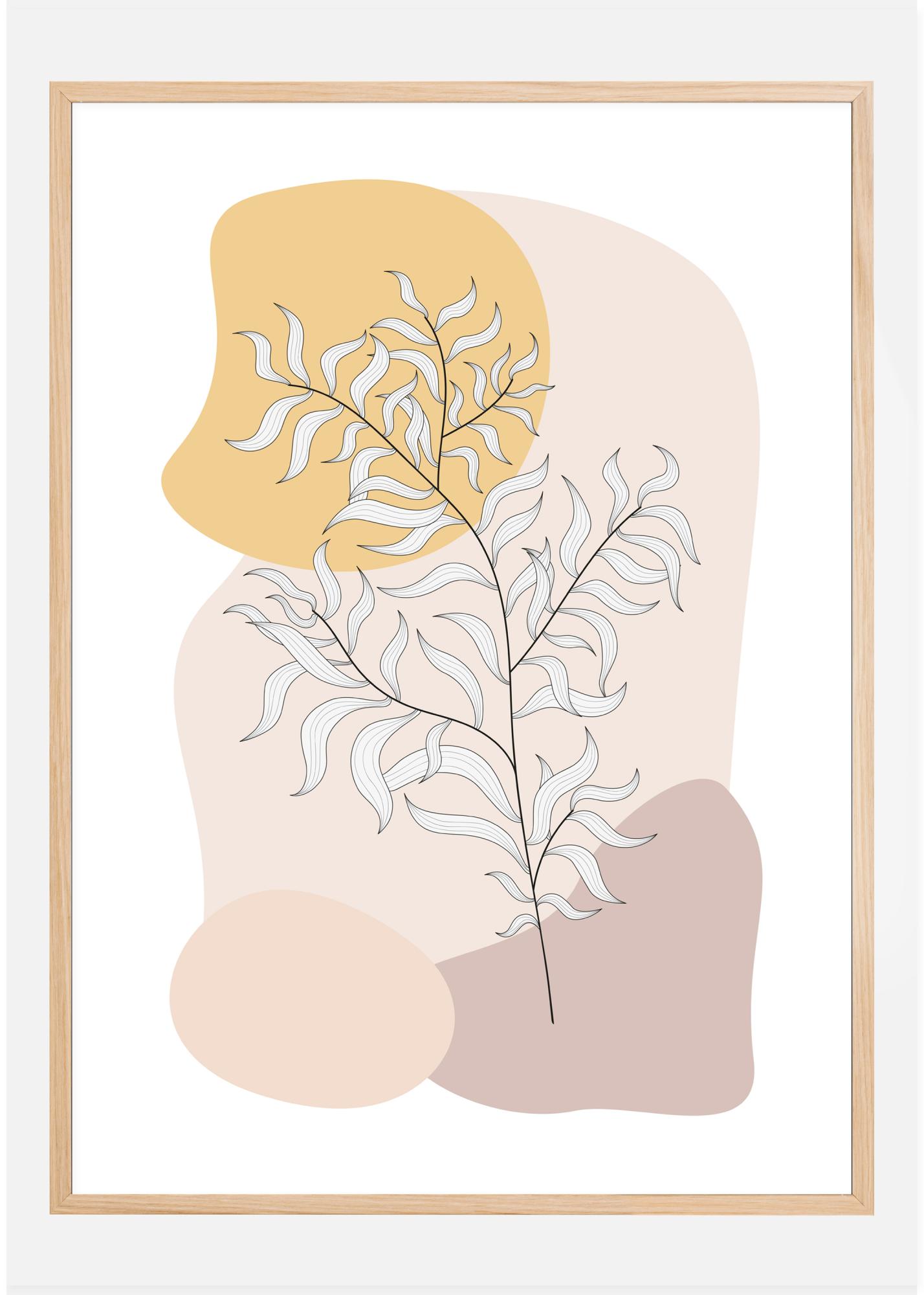 Tulostustyylinen juliste ohuesta oksasta, jossa on vihreitä lehtiä. Tyylitelty oksa ja mintunvihreät lehdet istuvat sarjan outojen muotojen päällä, joista jokainen on erivärinen. Alareunassa on harmaata ja ruskeaa kuin kivien värit. Yläosassa kirkkaan oranssi muoto edustaa aurinkoa, joka paistaa tähän pieneen kasviin.