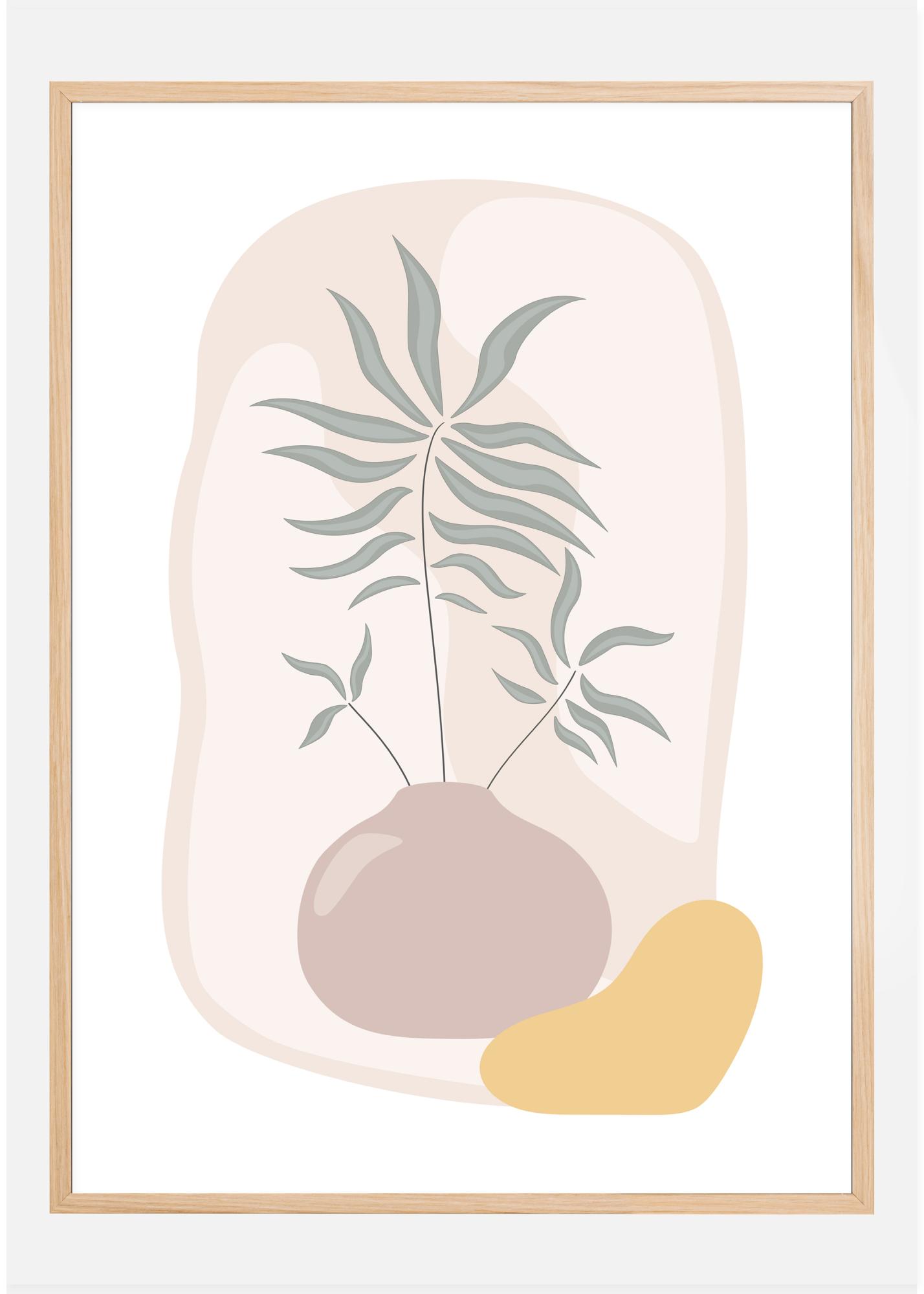 Tyylitelty maljakkojuliste, josta pulpahtaa esiin vihreä kasvi. Muut oudot muodot ja värit täyttävät taustan ja tekevät tästä mielenkiintoisen mutta hieman abstraktin teoksen. Yhdistä samantyylisen piirroksen kanssa ja luo oma minigalleriasi kotiin.