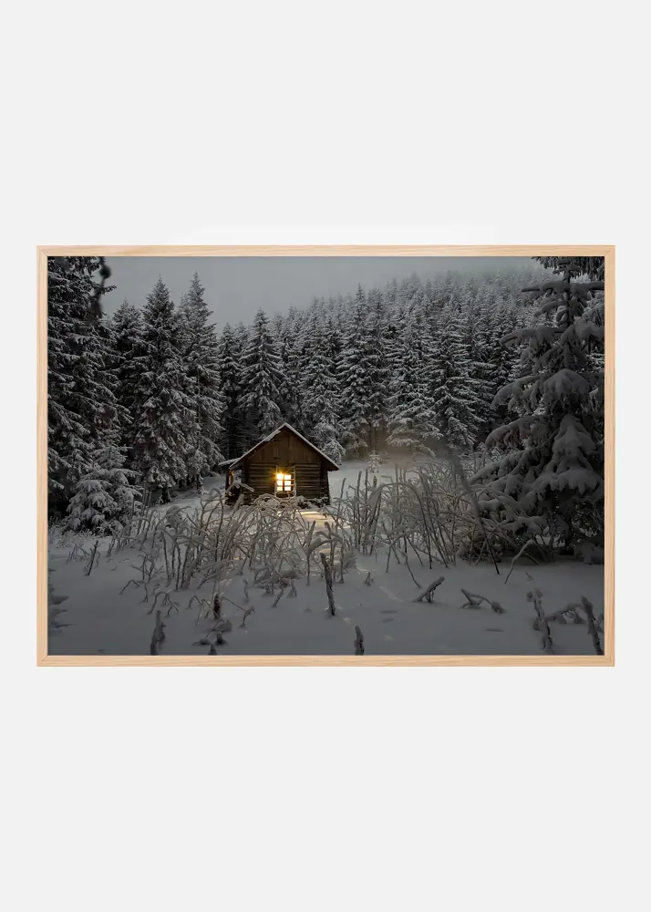 Juliste suloisesta hirsimökistä talvella, syvällä kuusimetsässä. Valoa ikkunasta pakkastalviyönä antaa valokuvalle syvyyttä ja tekee maalauksesta mielenkiintoisen. Kuva sopii kaikkiin tyyleihin ja ympäristöihin. Se on yhtä hieno ohuemmassa mustassa metallikehyksessä tai miksi ei klassisessa kultakehyksessä.